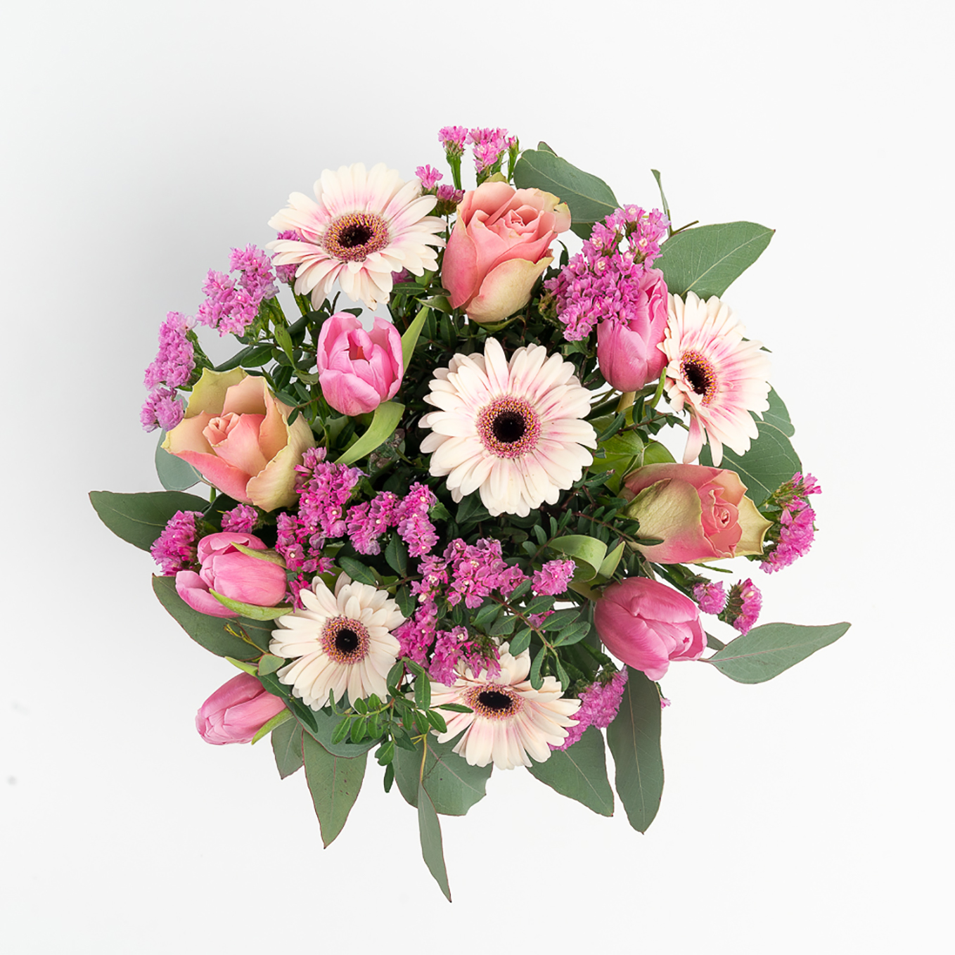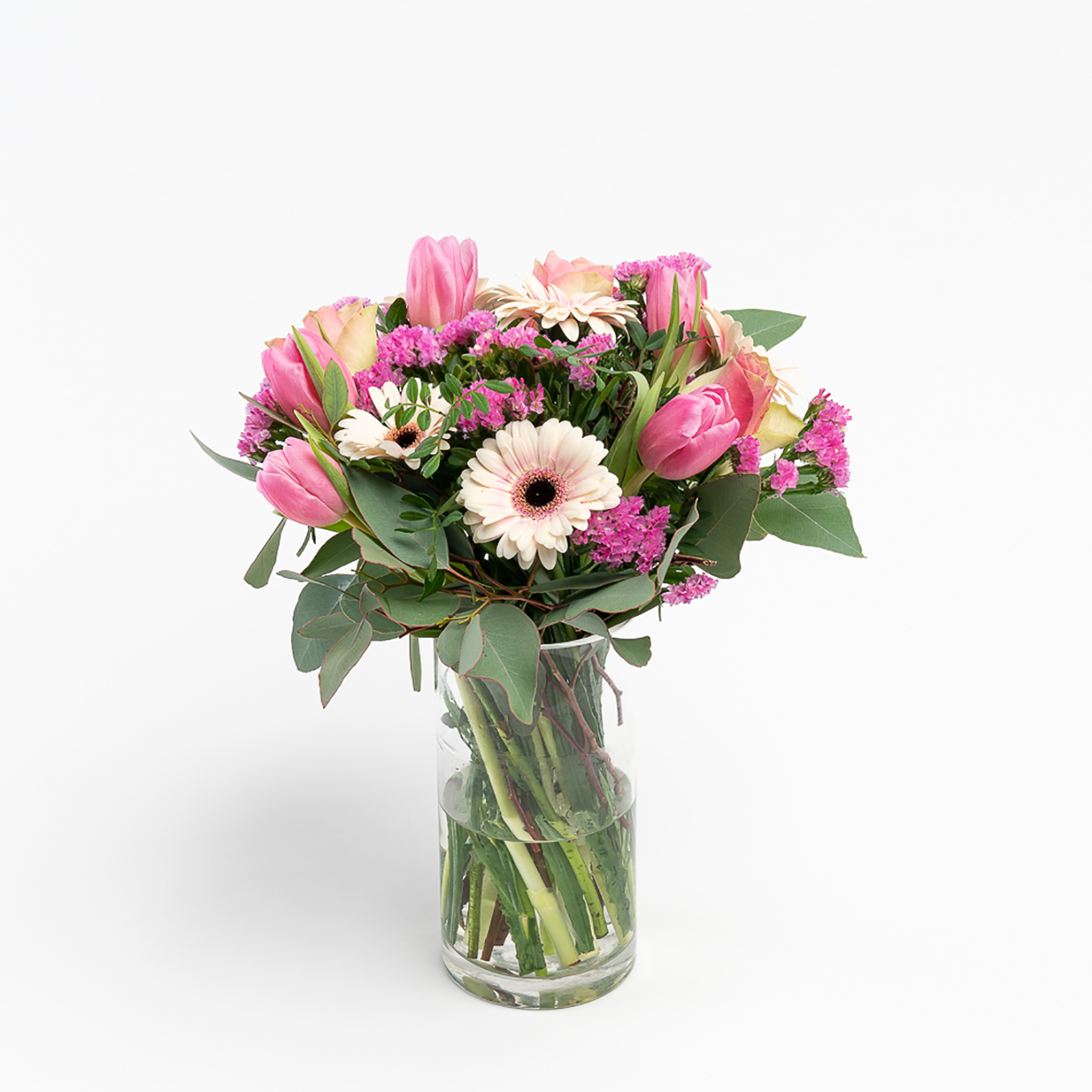 Ramo de flores variadas composto por Rosas, Gerberas, tulipas, statis e verdes variados. A imagem corresponde ao tamanho M.