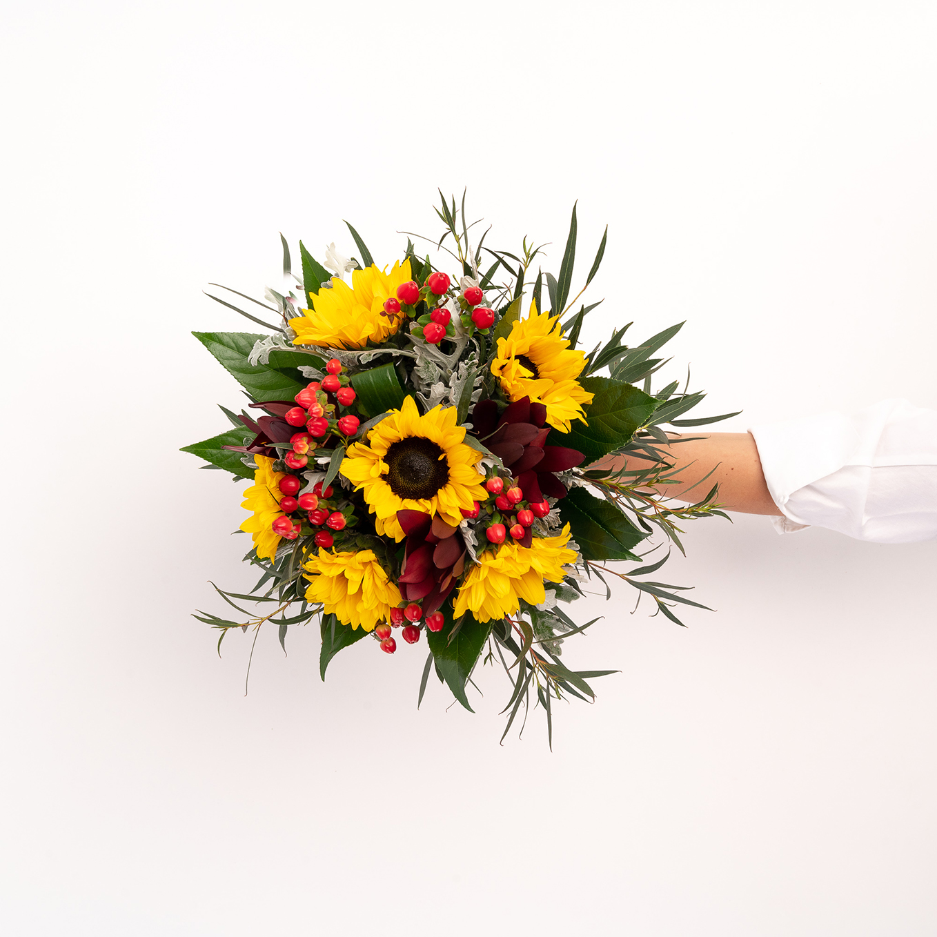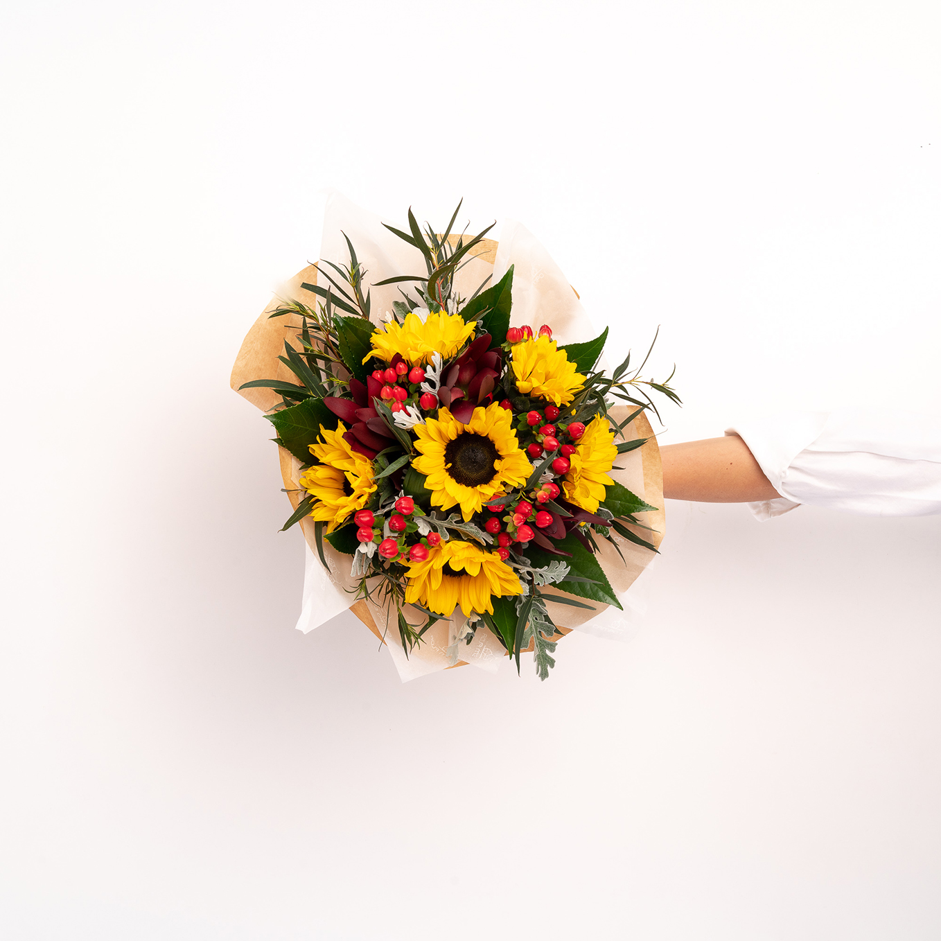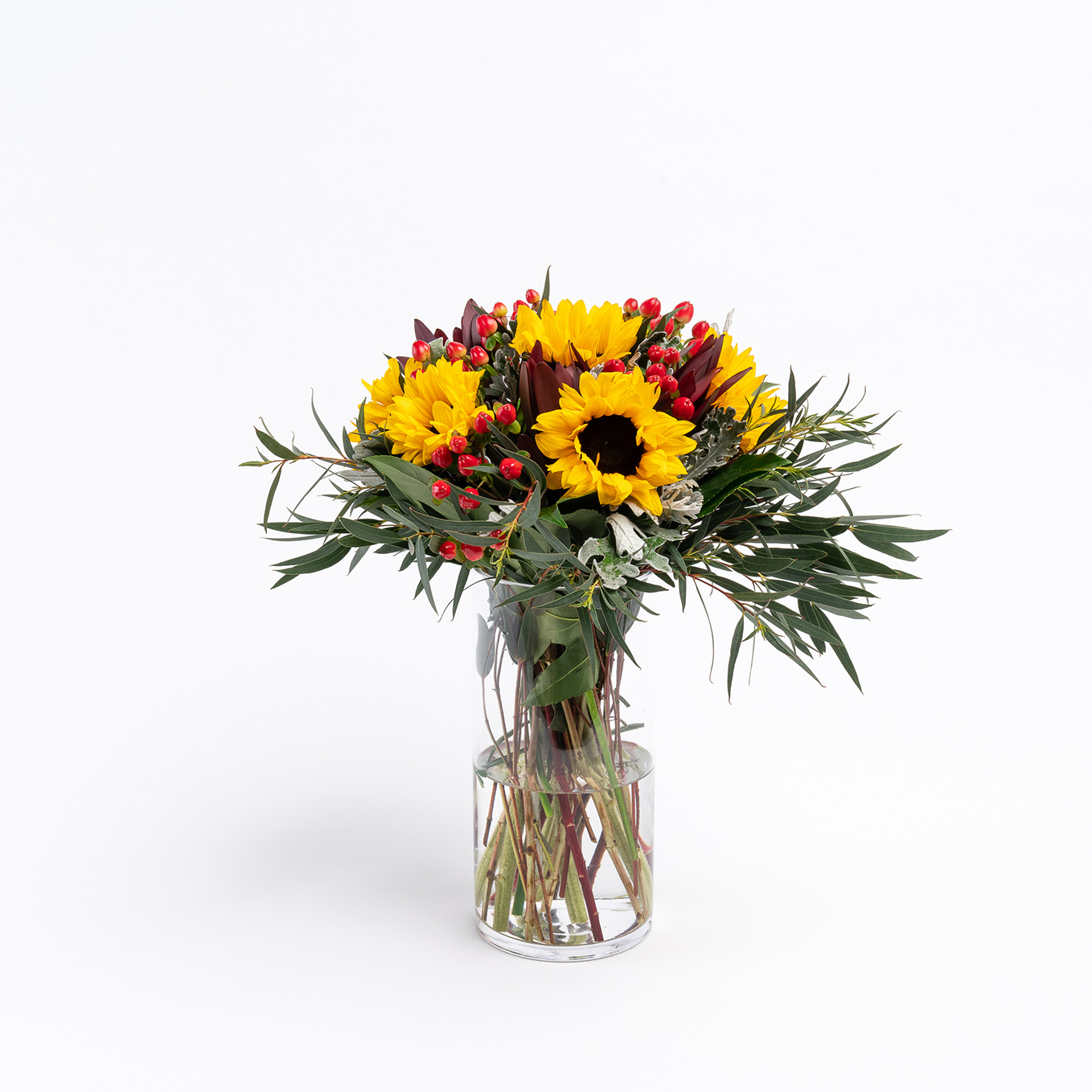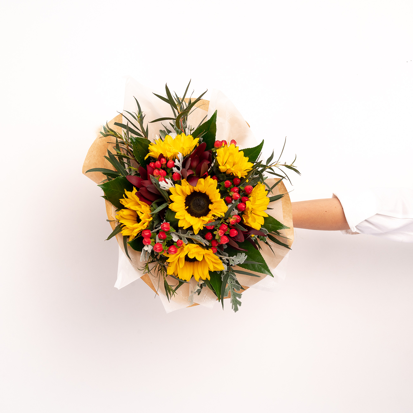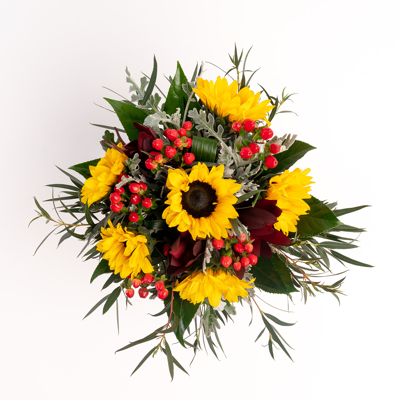 Ramo composto por girassóis, hipericão, leucadendros e verdes variados. A imagem corresponde ao Tamanho M.