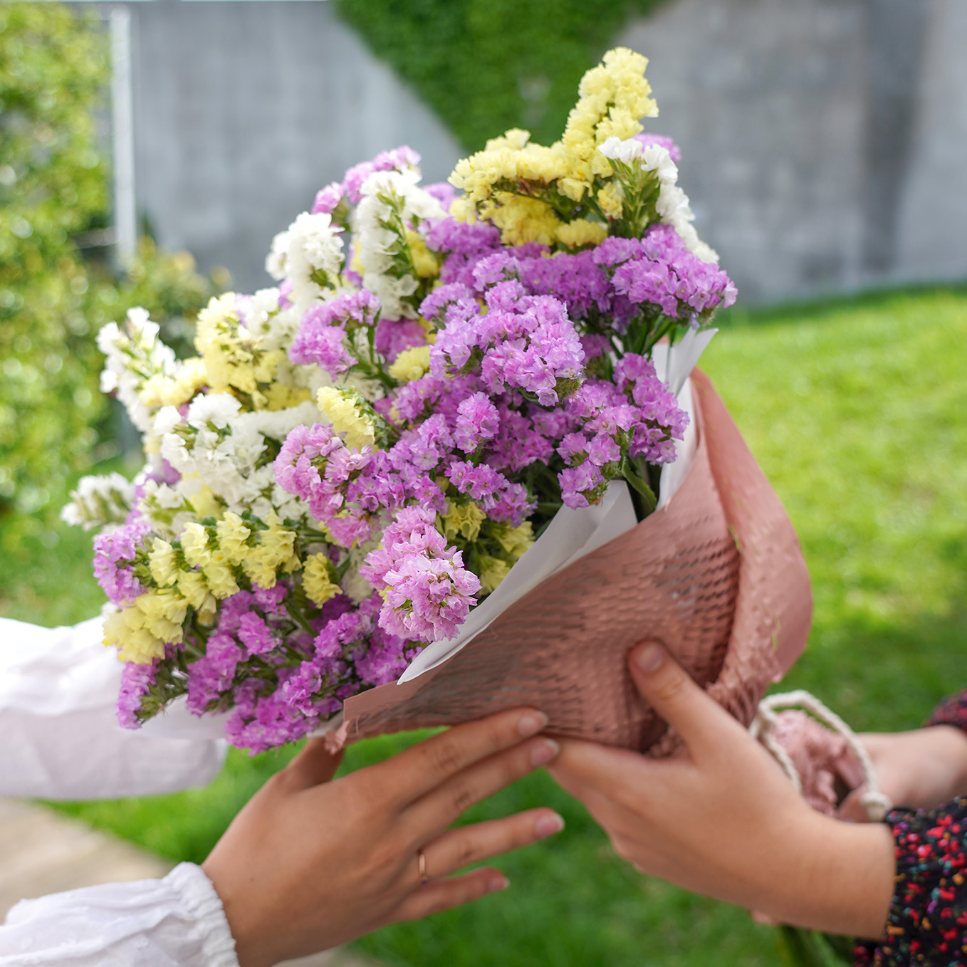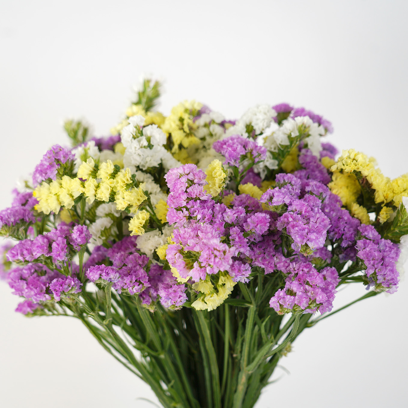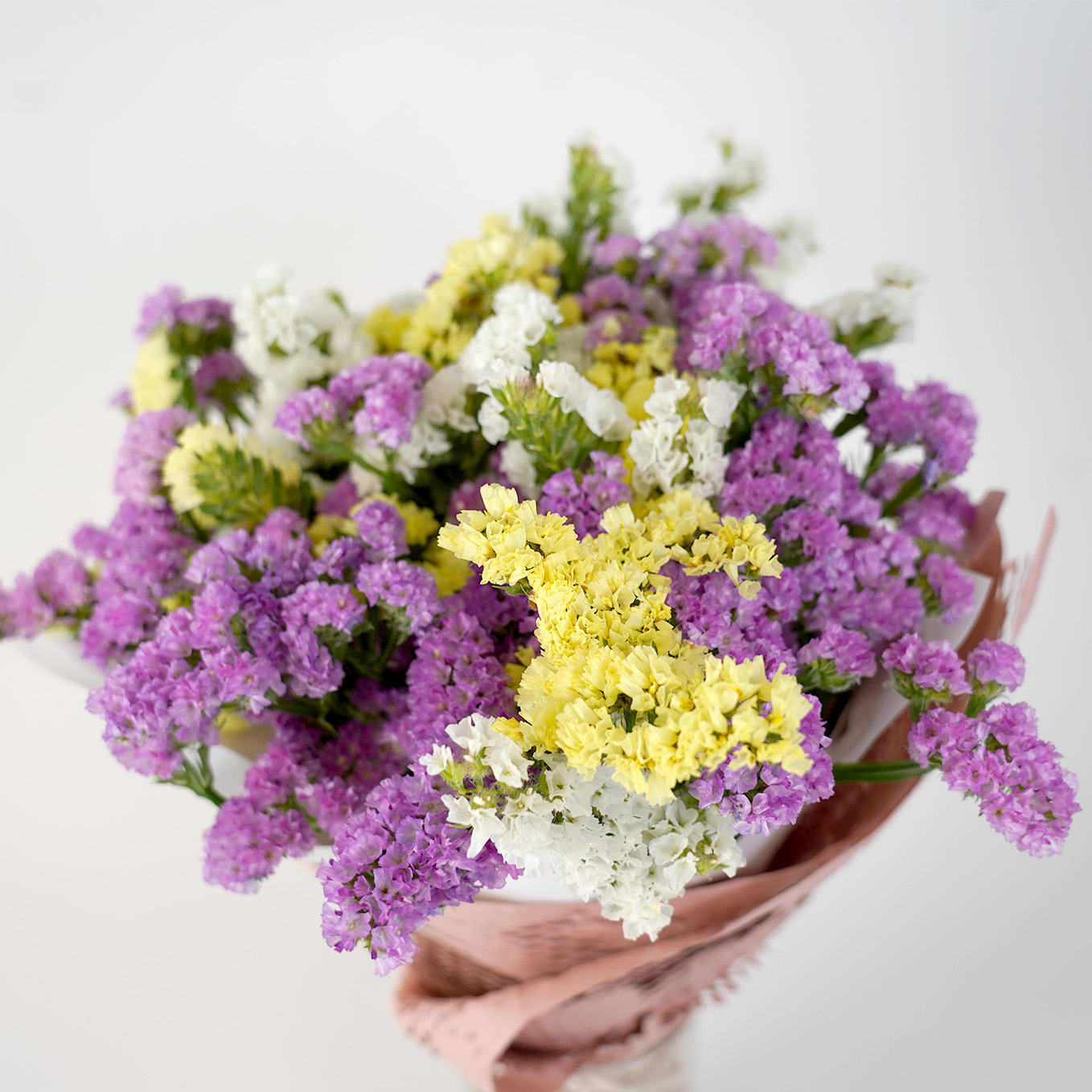 Atado de Statis. A Statice é uma flor de varias cores, é caracterizada por ser resistente ao sol e calor. Uma excelente opção campestre para ofecerer especialmente nos meses quentes. Adqua-se a vários climas sem precisar de água e não requer grandes cuidados de manutenção.
