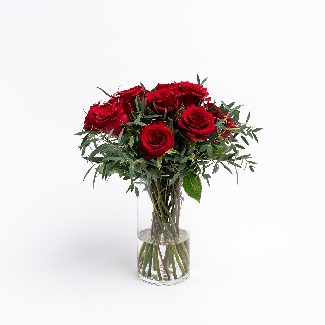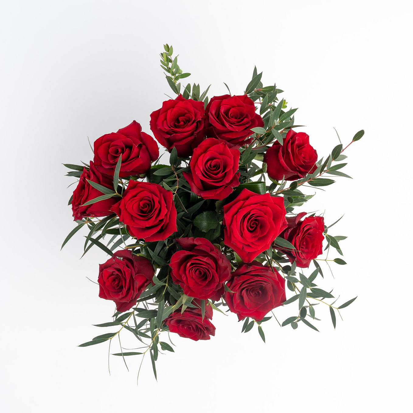 Ramo de rosas composto por Rosas vermelhas e verdes variados. A imagem coresponde ao tamanho M.