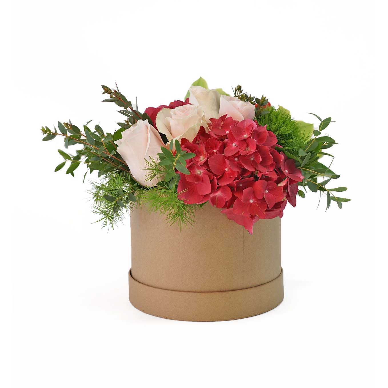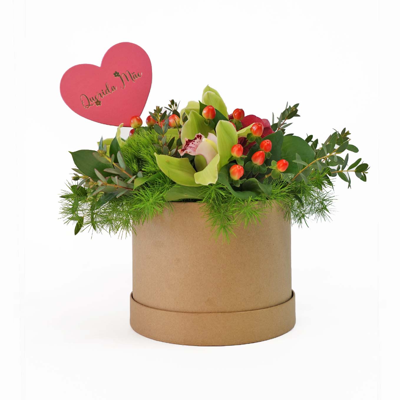 Caixa campestre composta por orquídeas, rosas, Hipiricão e Hortências. A imagem corresponde ao tamanho M.