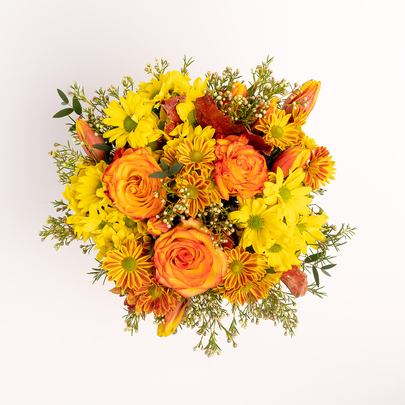 Ramo de flores variadas composto por Rosas,margaridas, tulipas, flor de cera e verdes variados. A imagem corresponde ao tamanho M.