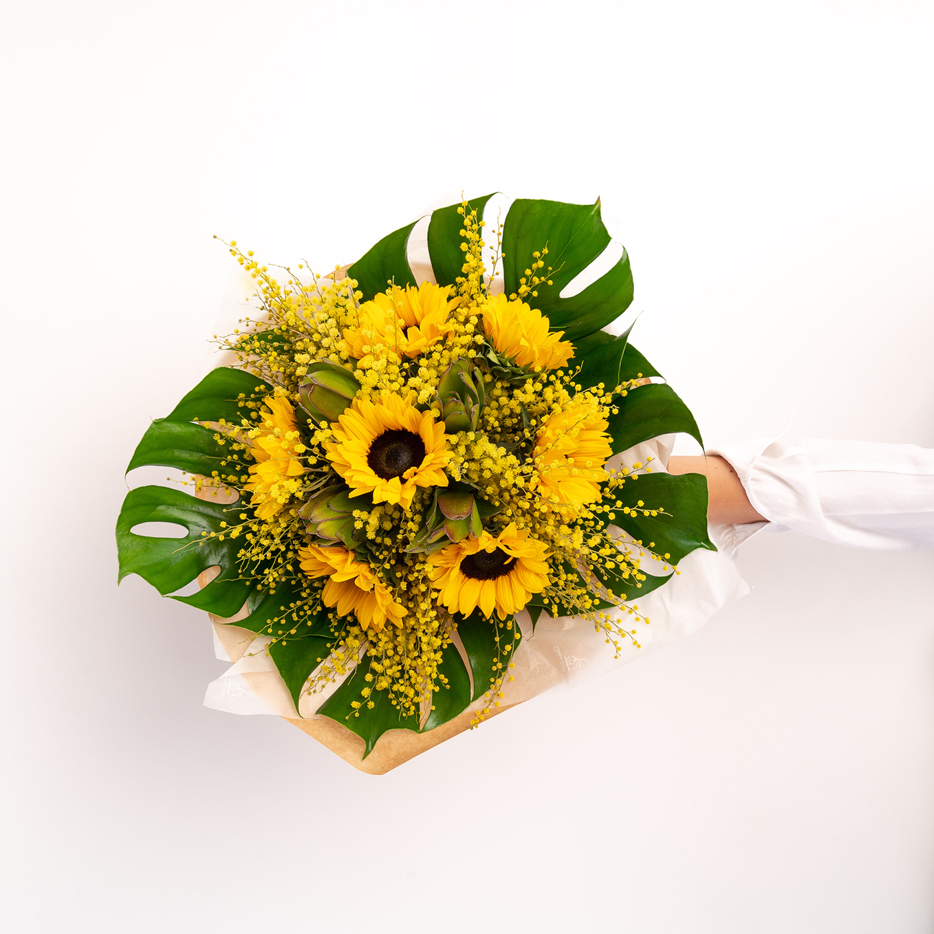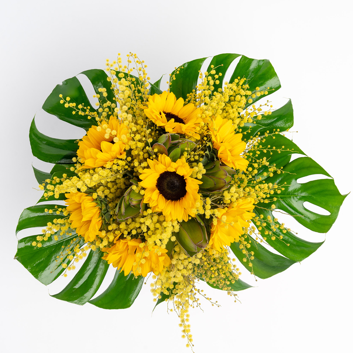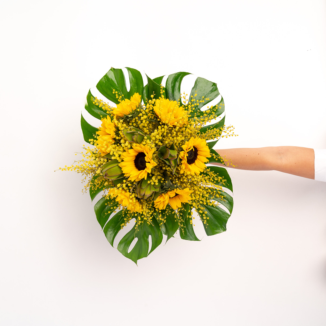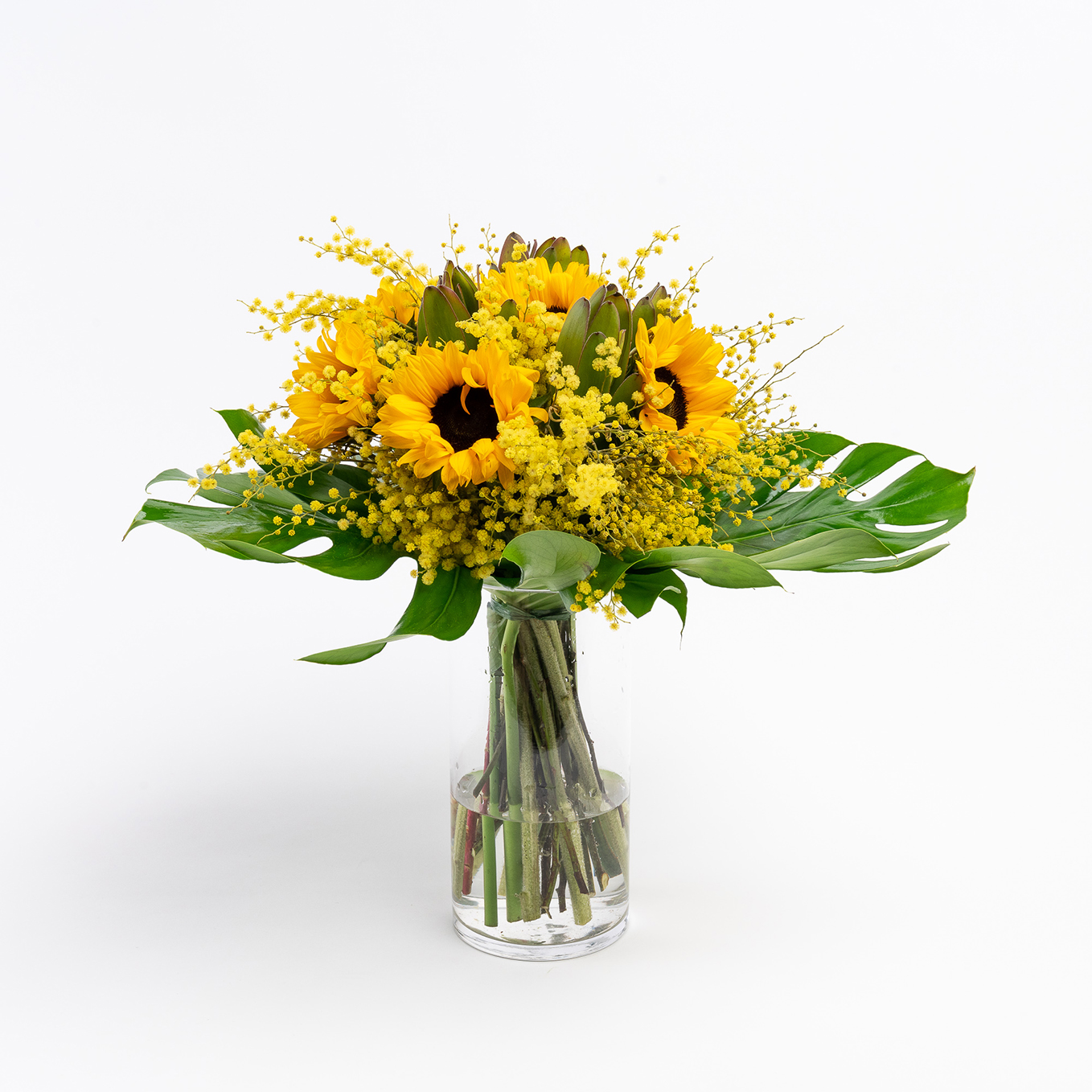 Ramo de girassóis composto por Girassóis e verdes variados. A imagem corresponde ao tamanho M.