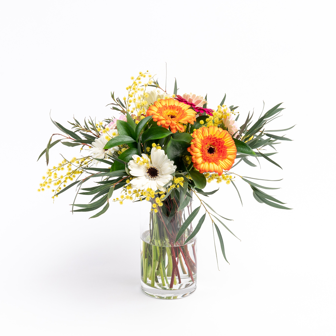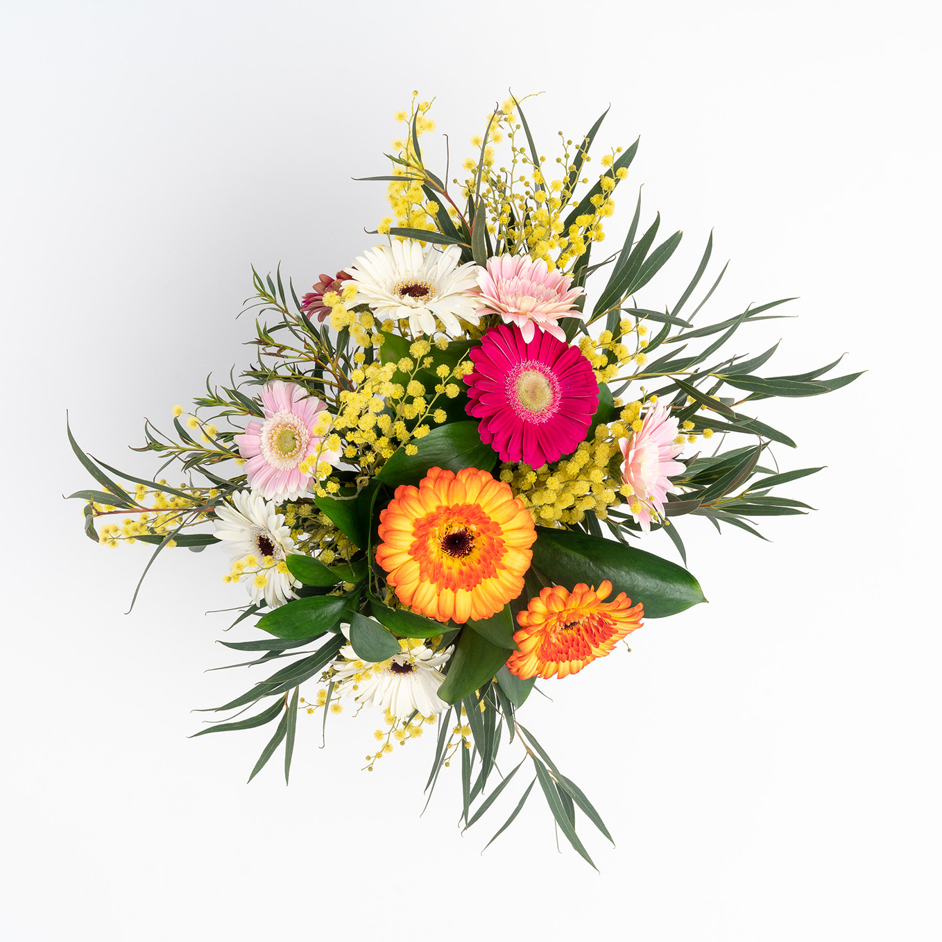 Ramo de gerberas de várias cores e verdes variados. Tamanho S: 10 gerberas e verdes variados, Tamanho M: 15 gerberas e verdes variados, Tamanho L: 20 gerberas e verdes variados. A imagem coresponde ao tamanho M.