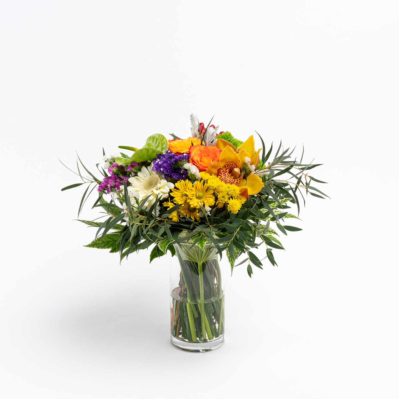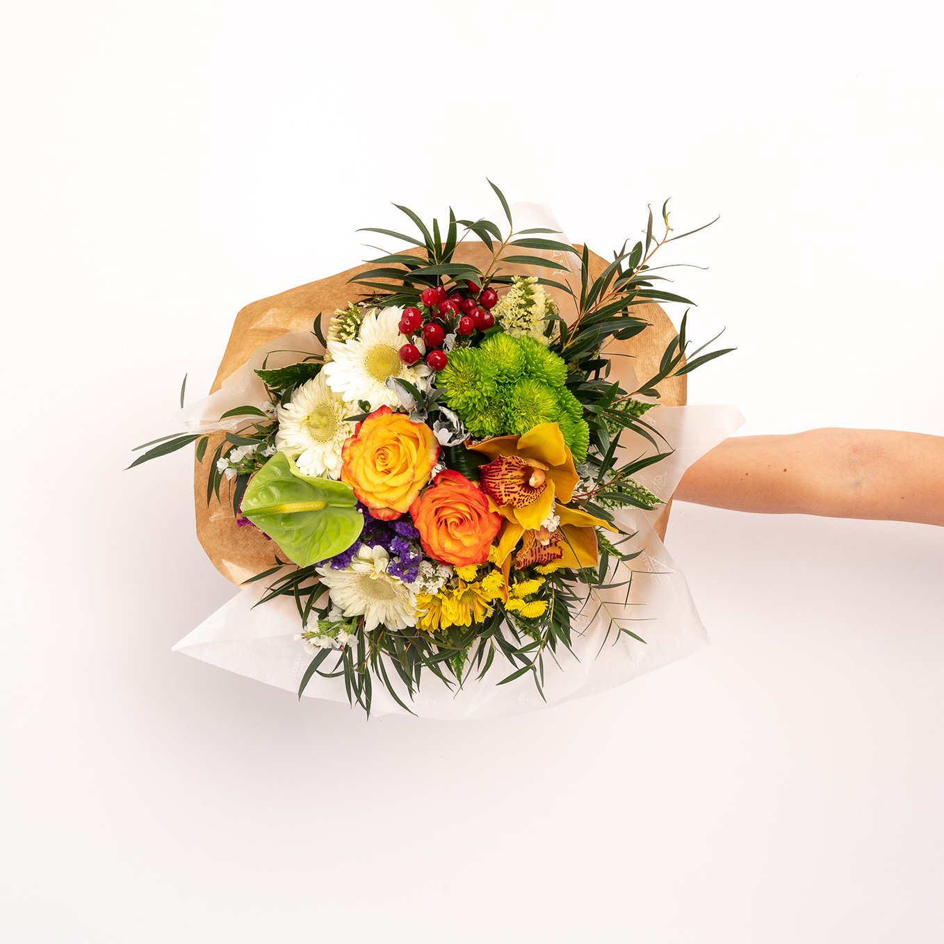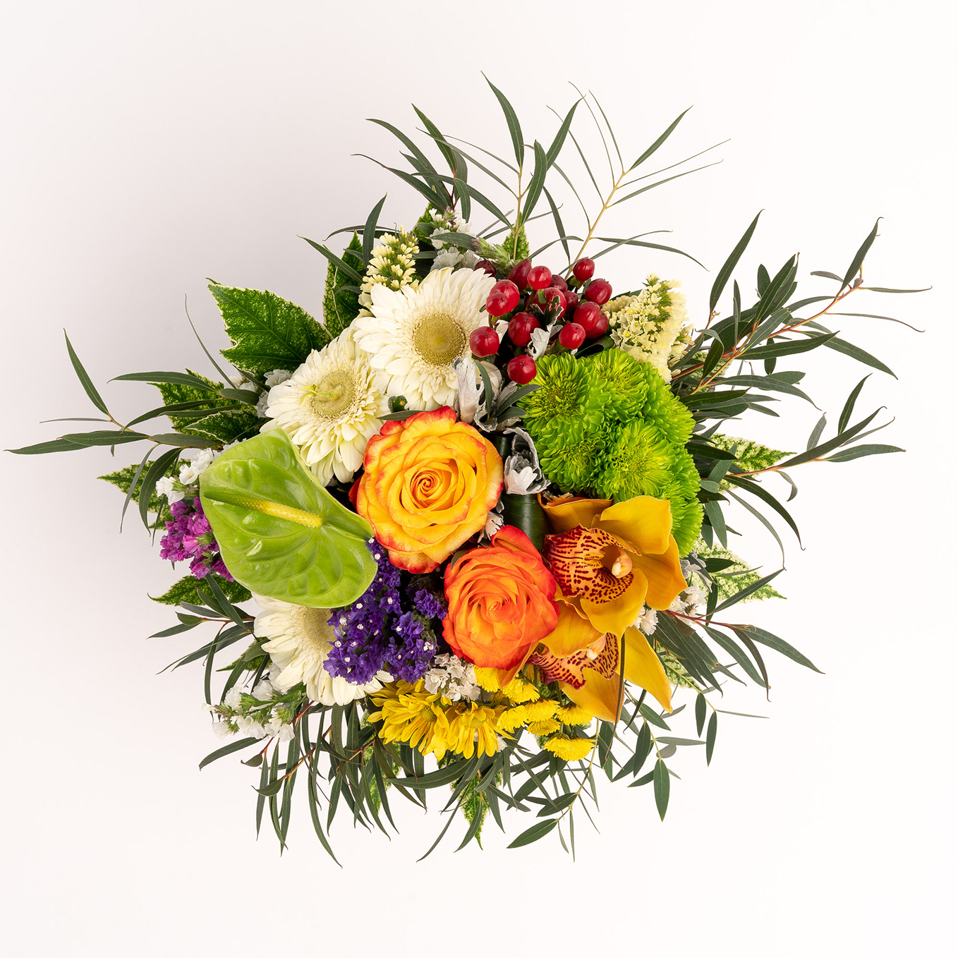 Ramo com flores variado composto por gerberas, rosas, orquídeas, hipericão, margaridas, antúrios e statis. A imagem corresponde ao tamanho M.