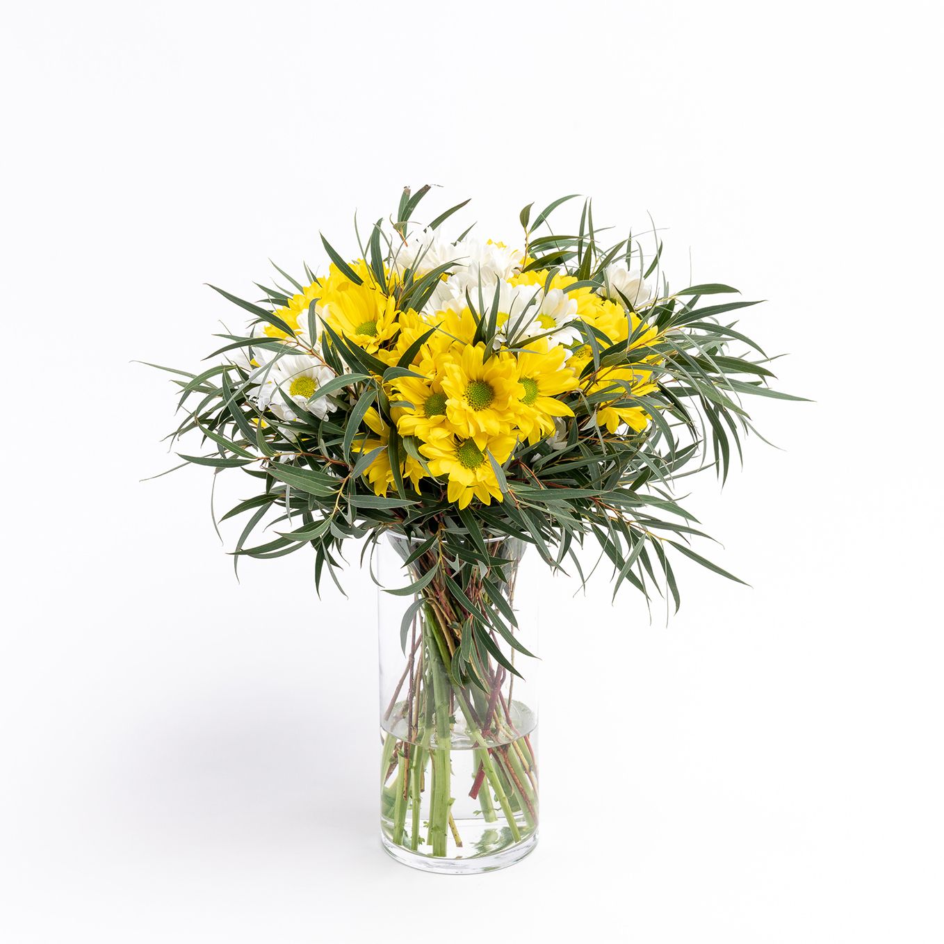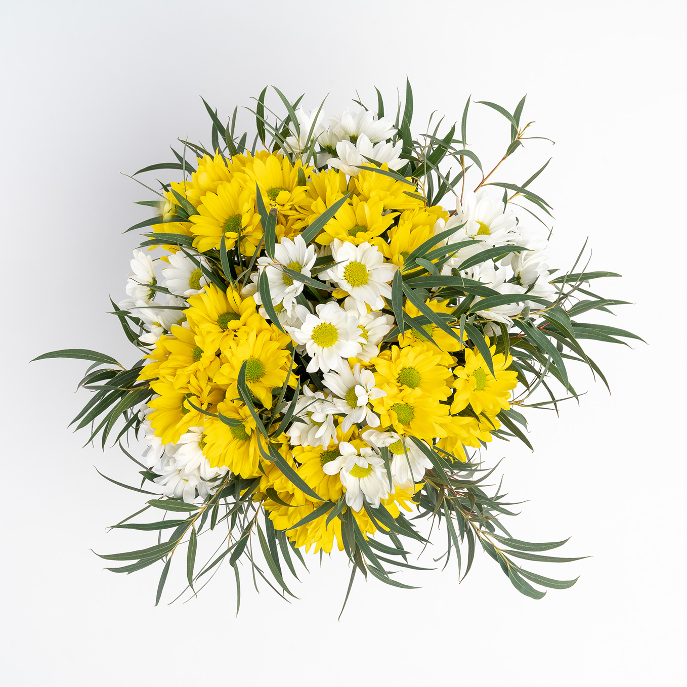 Ramo composto por margaridas brancas, amarelas e verdes variados. A imagem corresponde ao tamanho M.