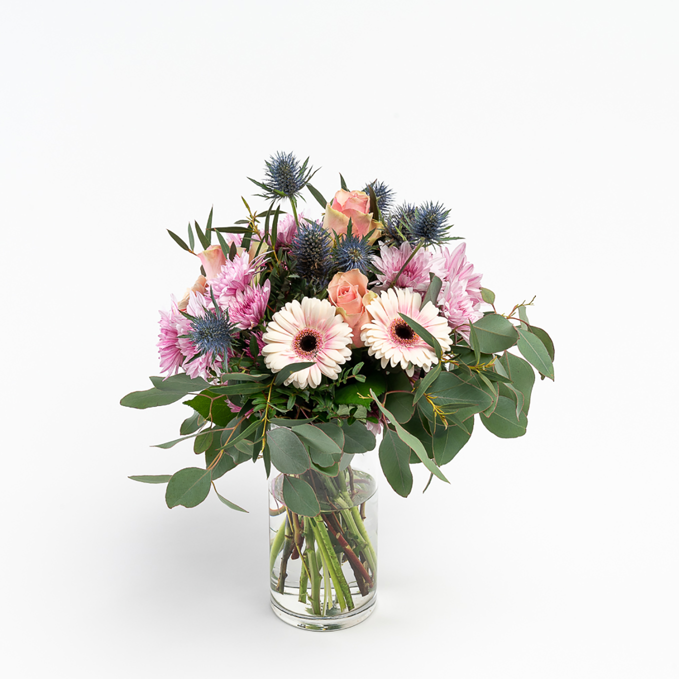 Ramo composto por margaridas,Erigium, gerberas, rosas e verdes variados. A imagem coresponde ao tamanho S.