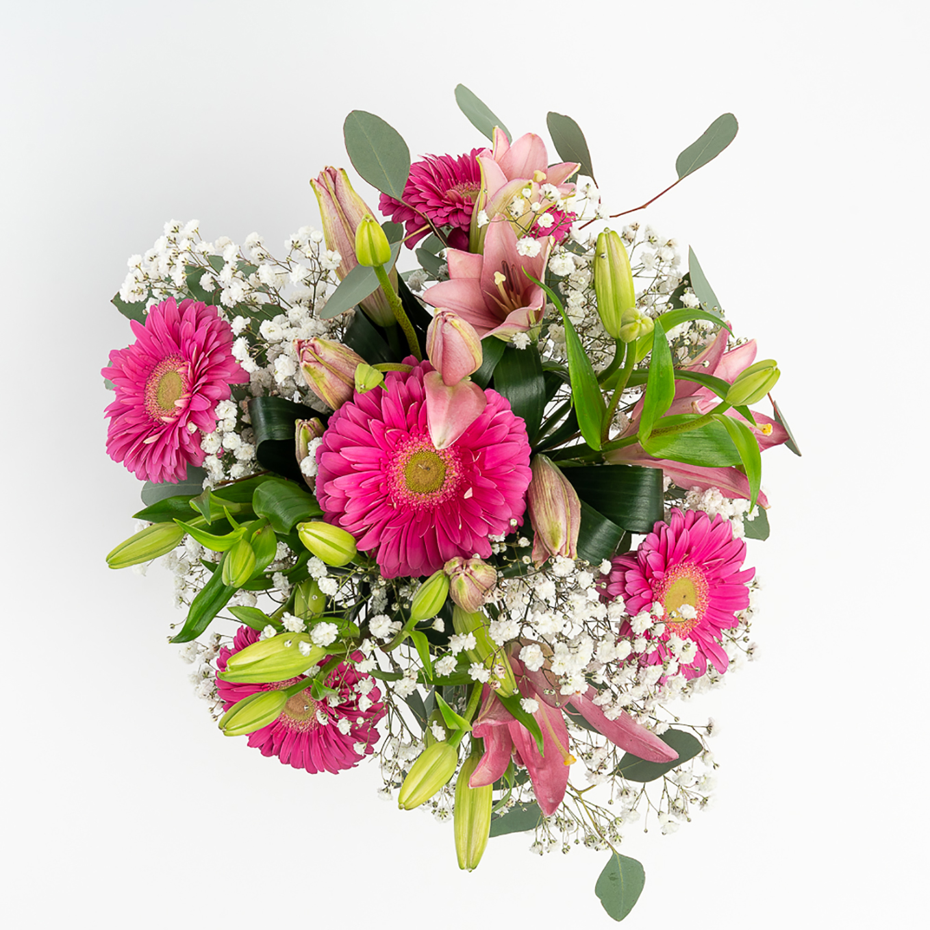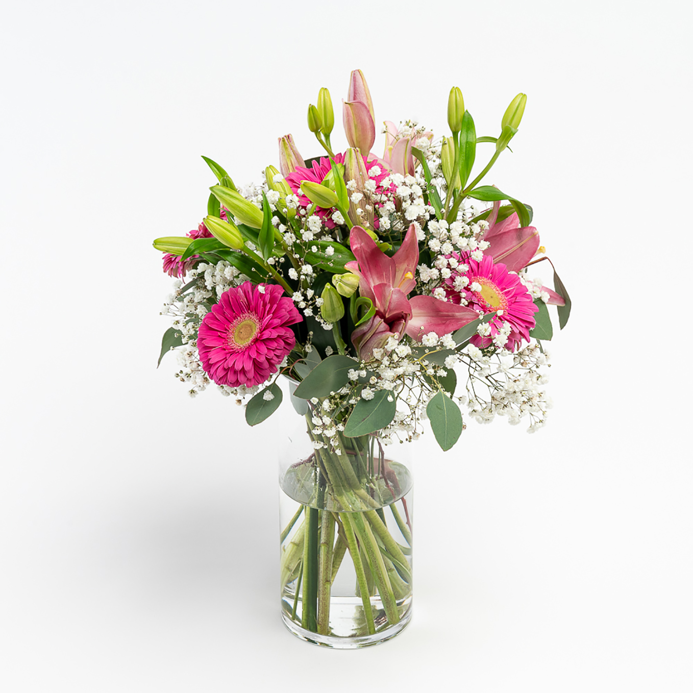 Ramo composto por gerberas, lilium L.A, vivaz e verdes variados. A imagem corresponde ao tamanho M.