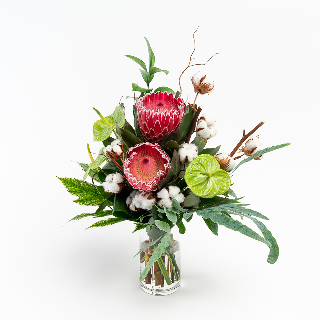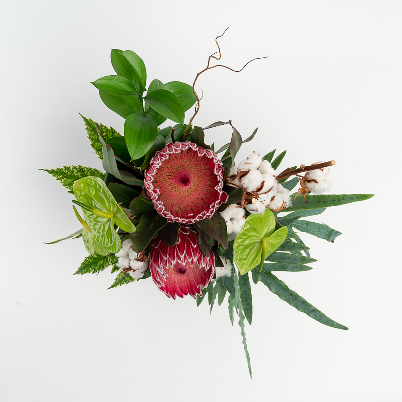 Ramo composto por antúrios, proteas, flor de algodão e verdura variada. Tamanho S: 2 antúrios, 1 protea, 1 pé de flor de algodão e verdura variada Tamanho M: 3 antúrios, 2 proteas, 2 pés de flor de algodão e verdura variada. Tamanho L: 5 Antúrios, 3 proteas, 4 pés de flor de algodão e verdura variada. A imagem coresponde ao tamanho M.
