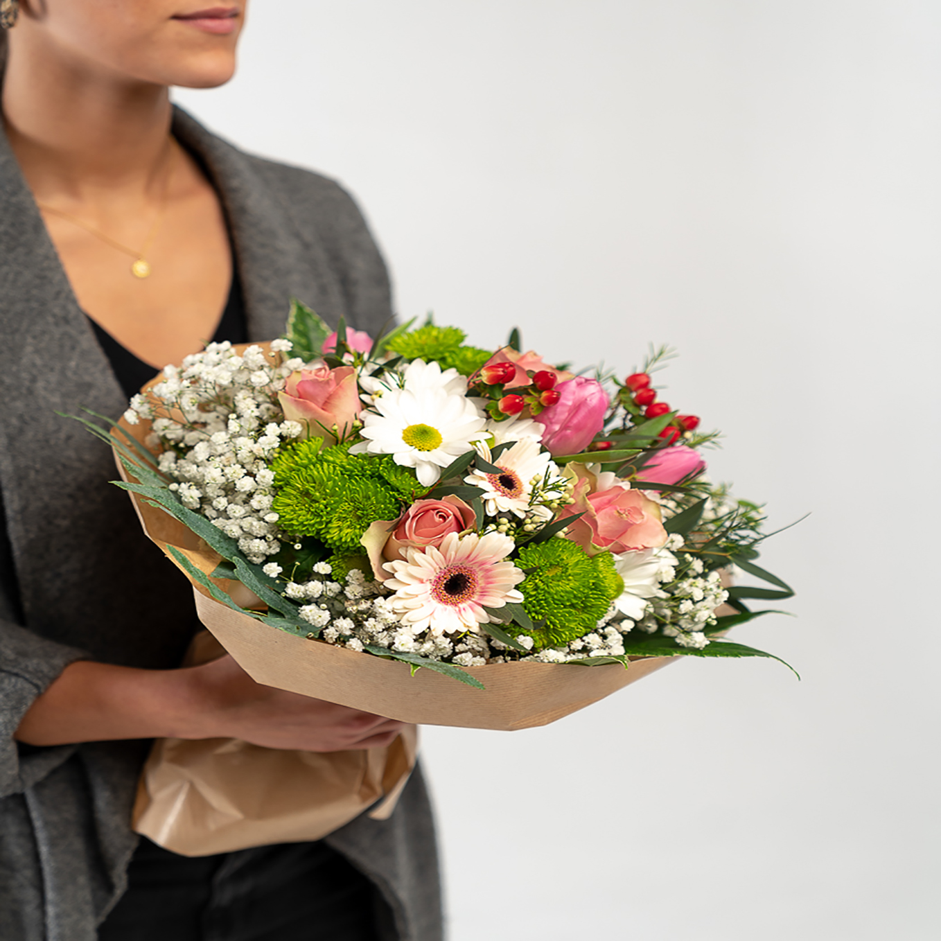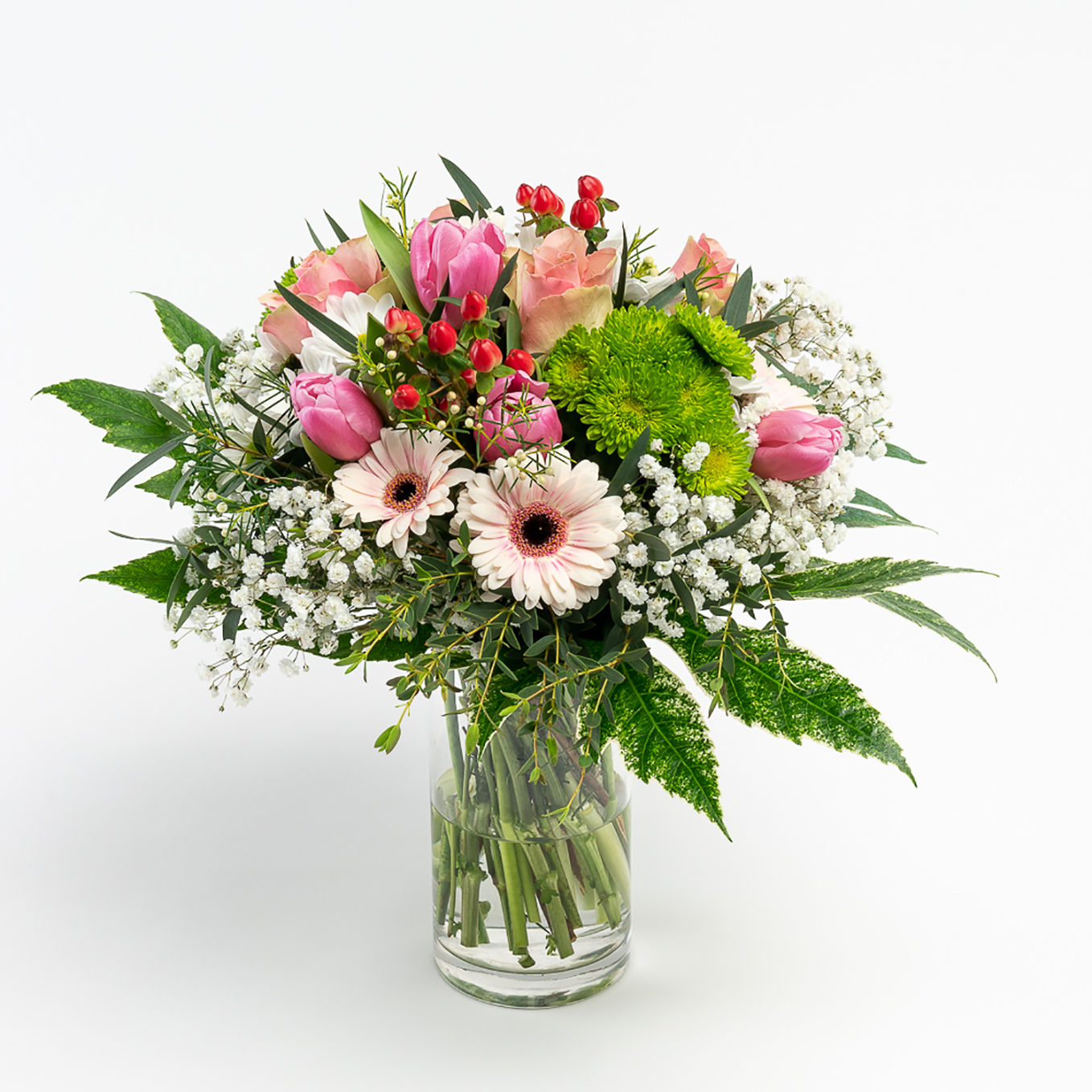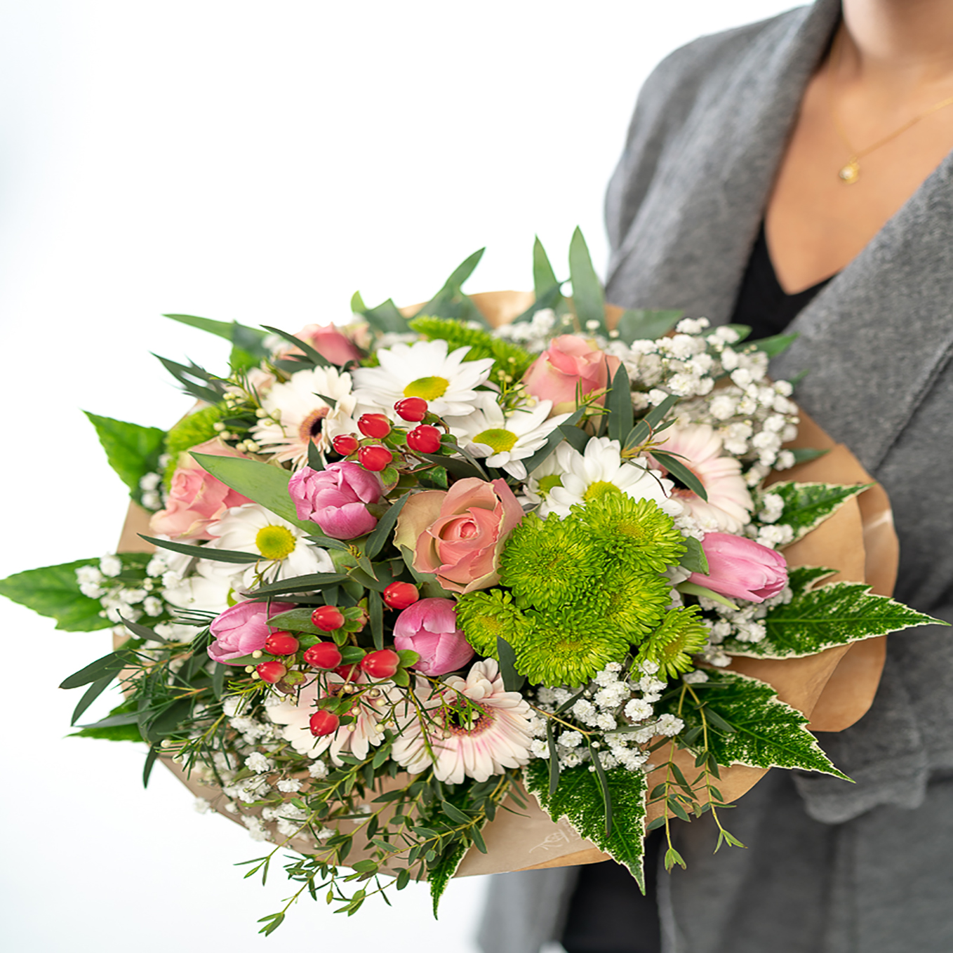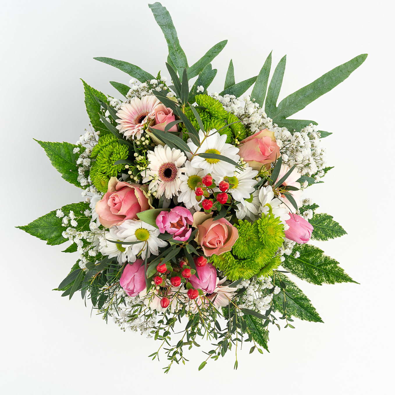 Ramo composto por margaridas , rosas, tulipas, vivaz, gerberas, e hipericão e verduras variadas. A imagem corrresponde ao tamanho M.
