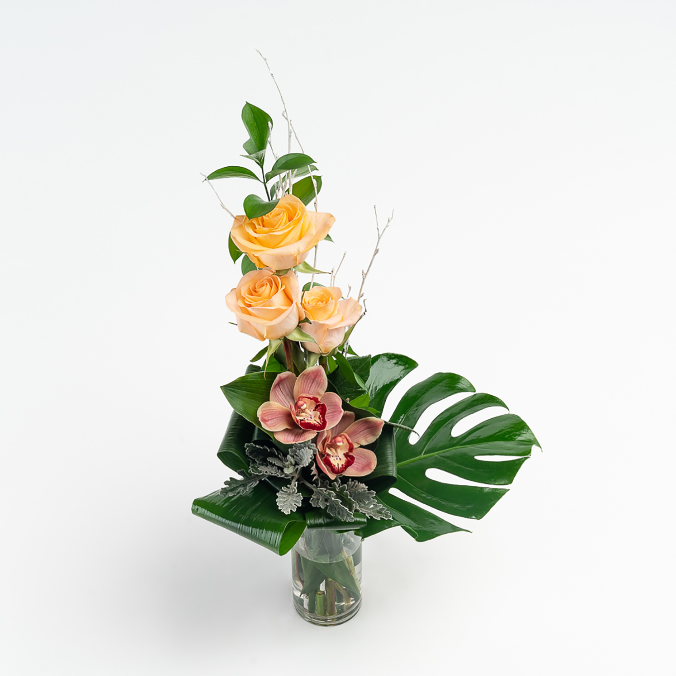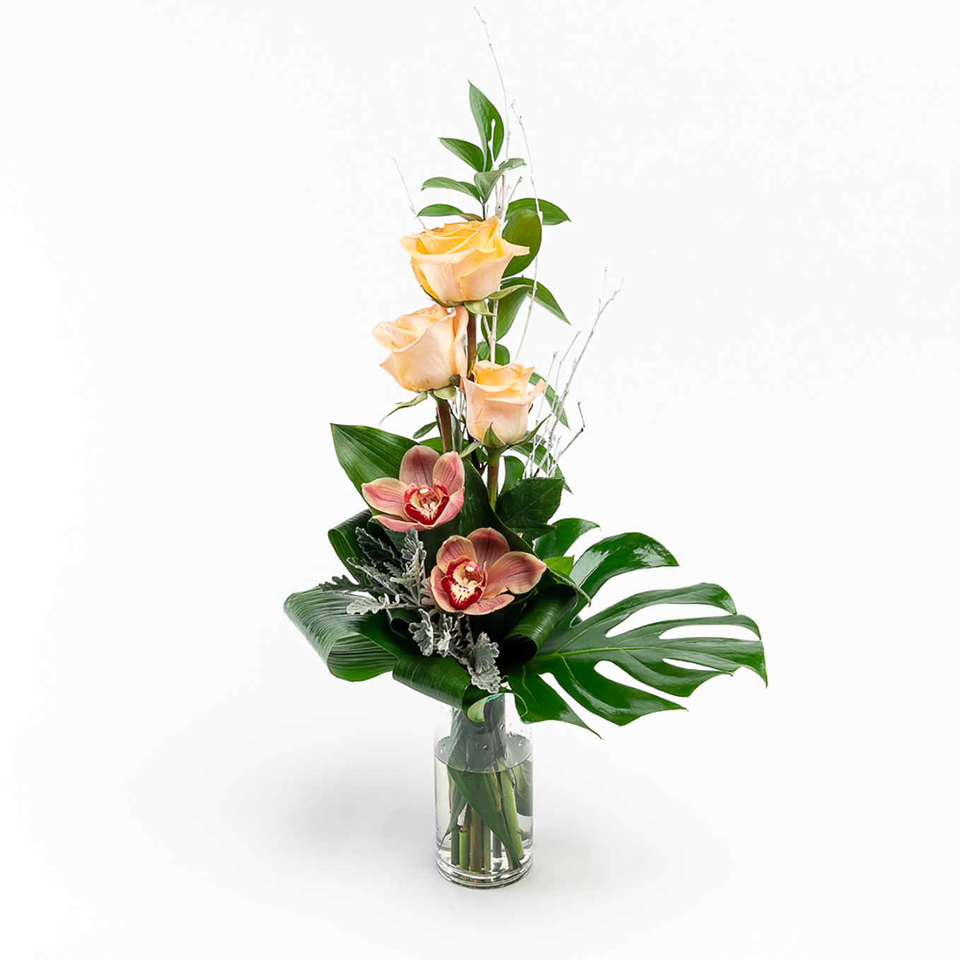 Ramo ao alto composto por rosas e orquídeas e verdura variadas. A imagem corresponde ao tamanho M.