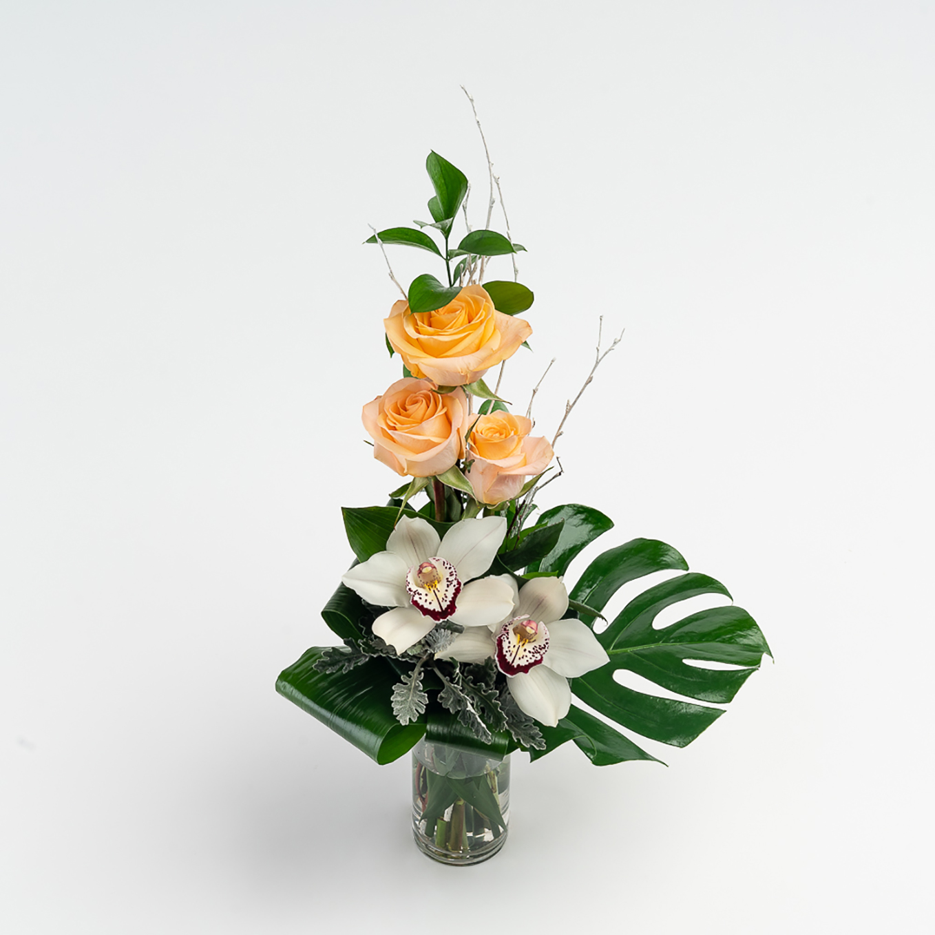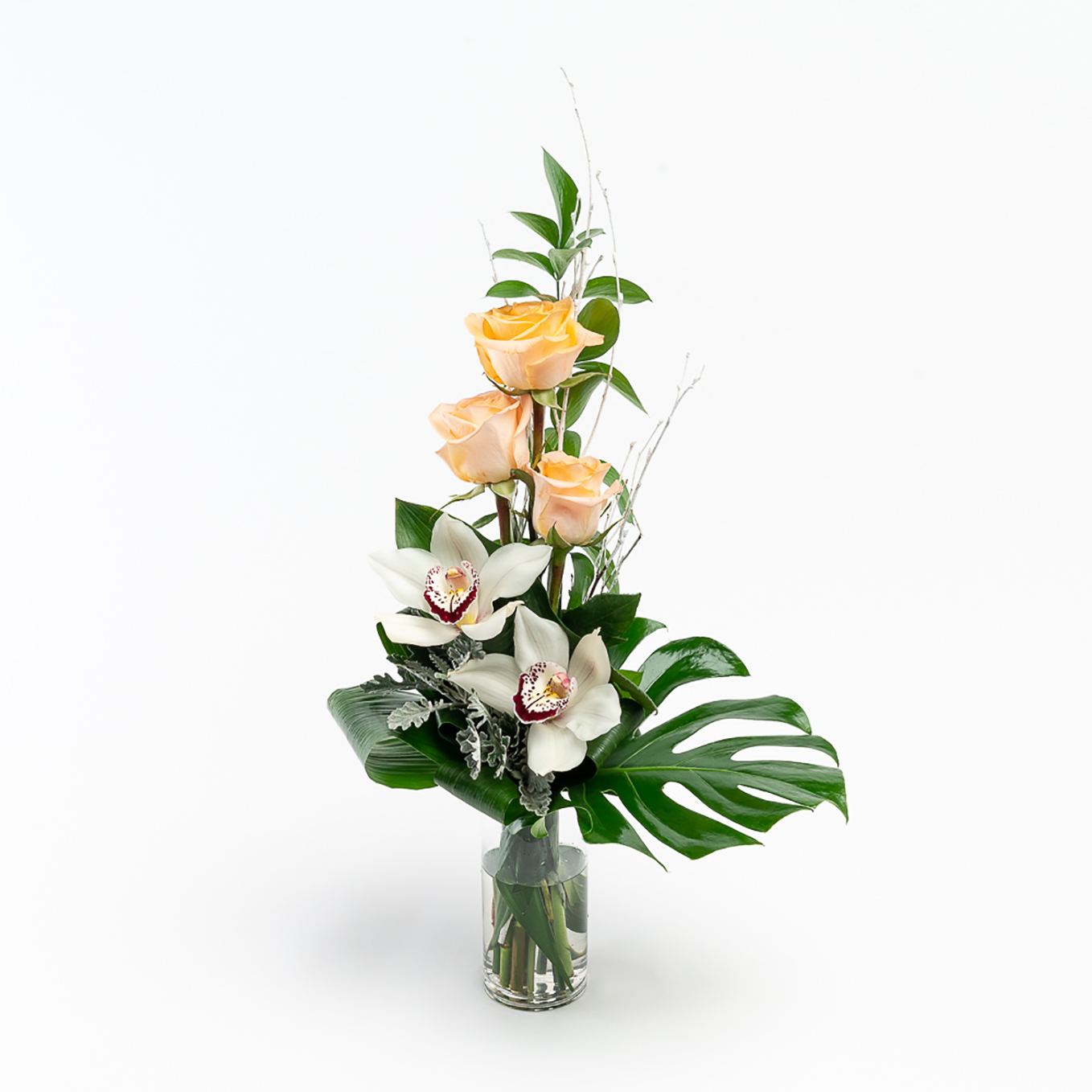 Ramo ao alto composto por rosas e orquídeas e verdura variadas. A imagem corresponde ao tamanho M.