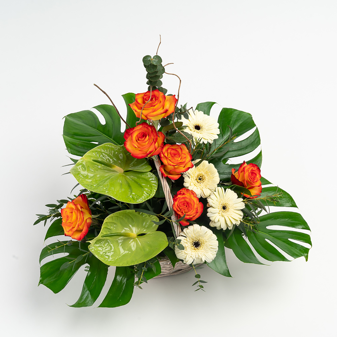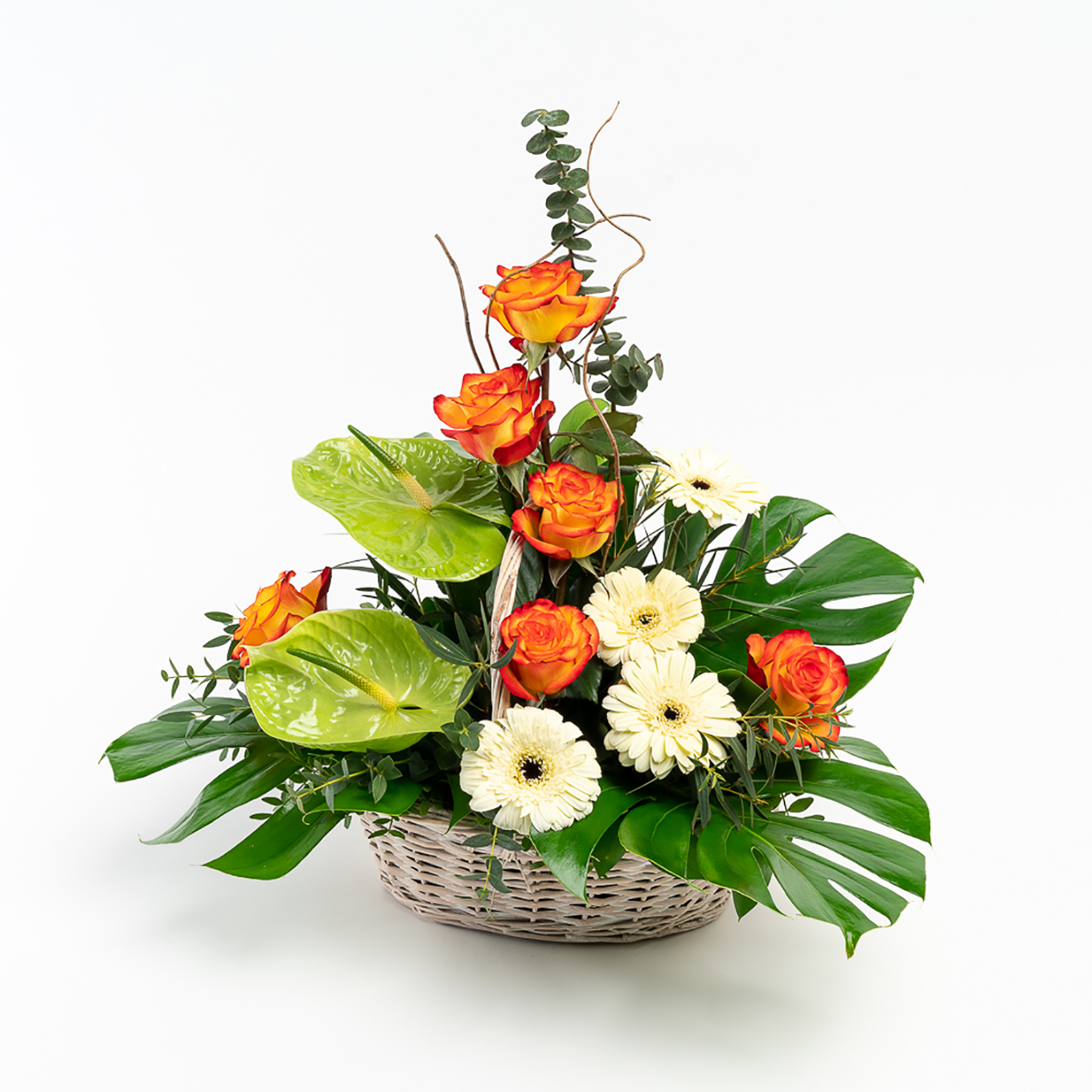 Cesta composta por rosas, gerberas, antúrios e antúrios variados.