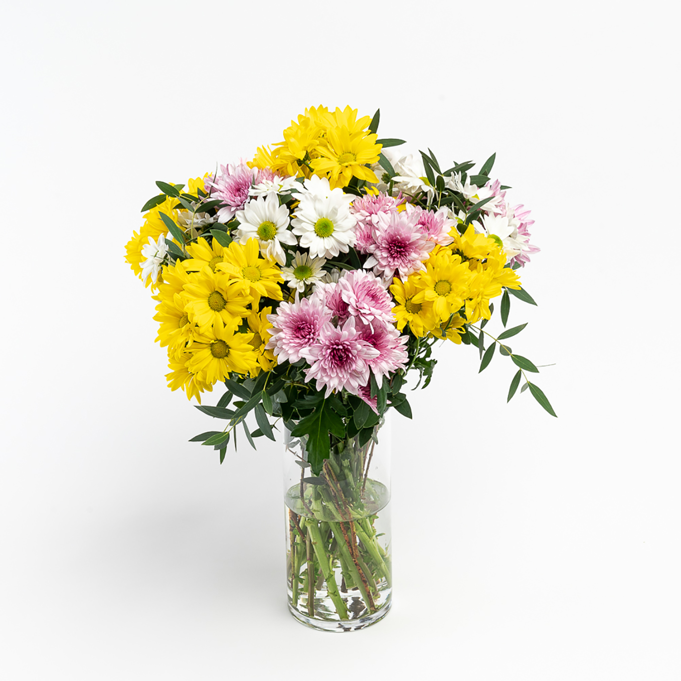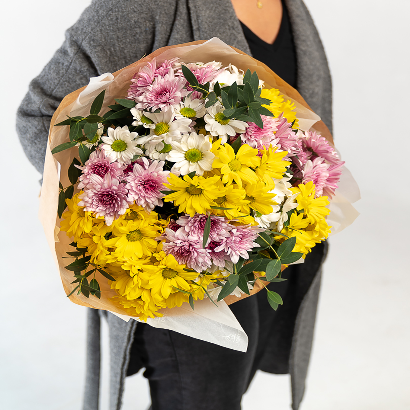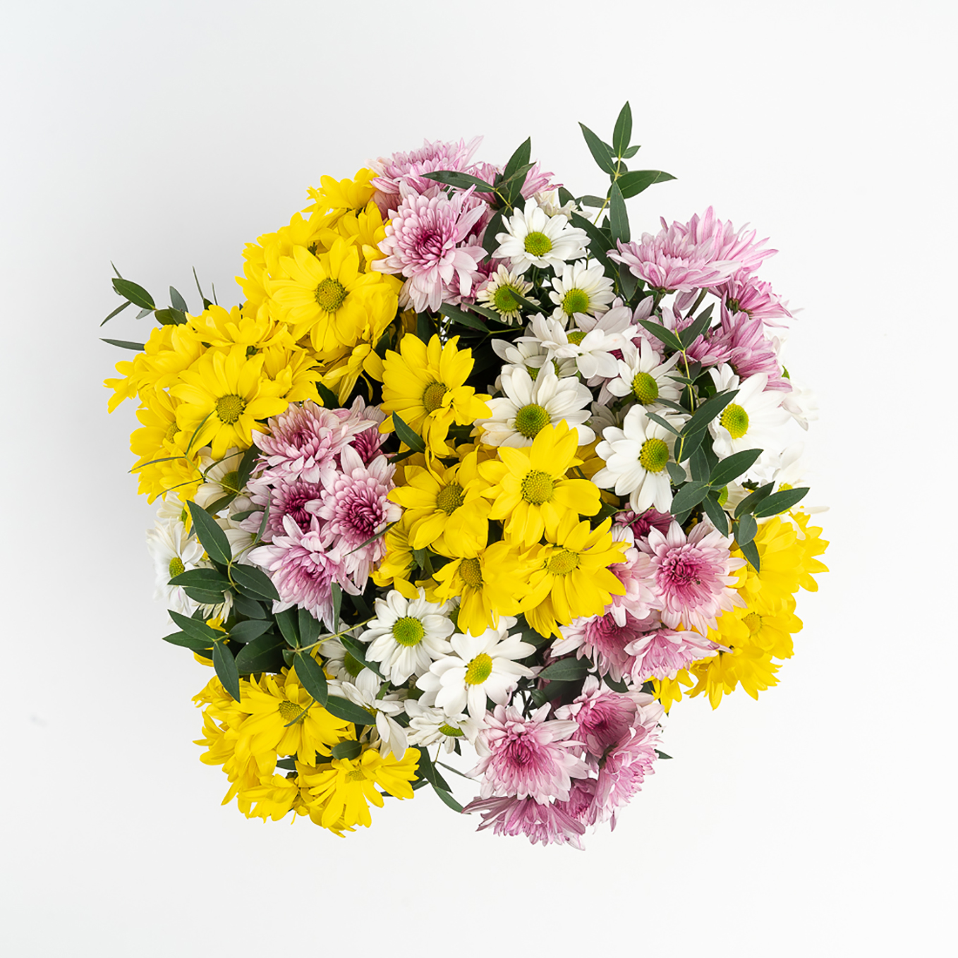 Ramo composto por margaridas e verdes variados. A imagem corresponde ao tamanho M.