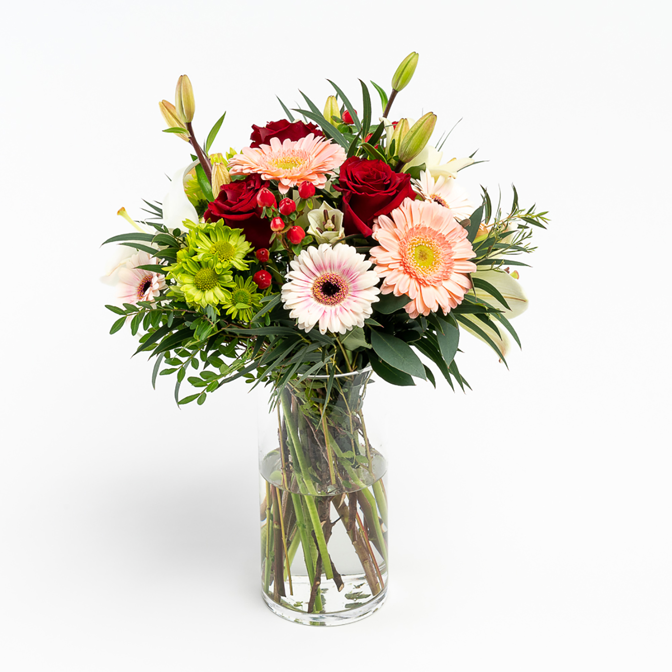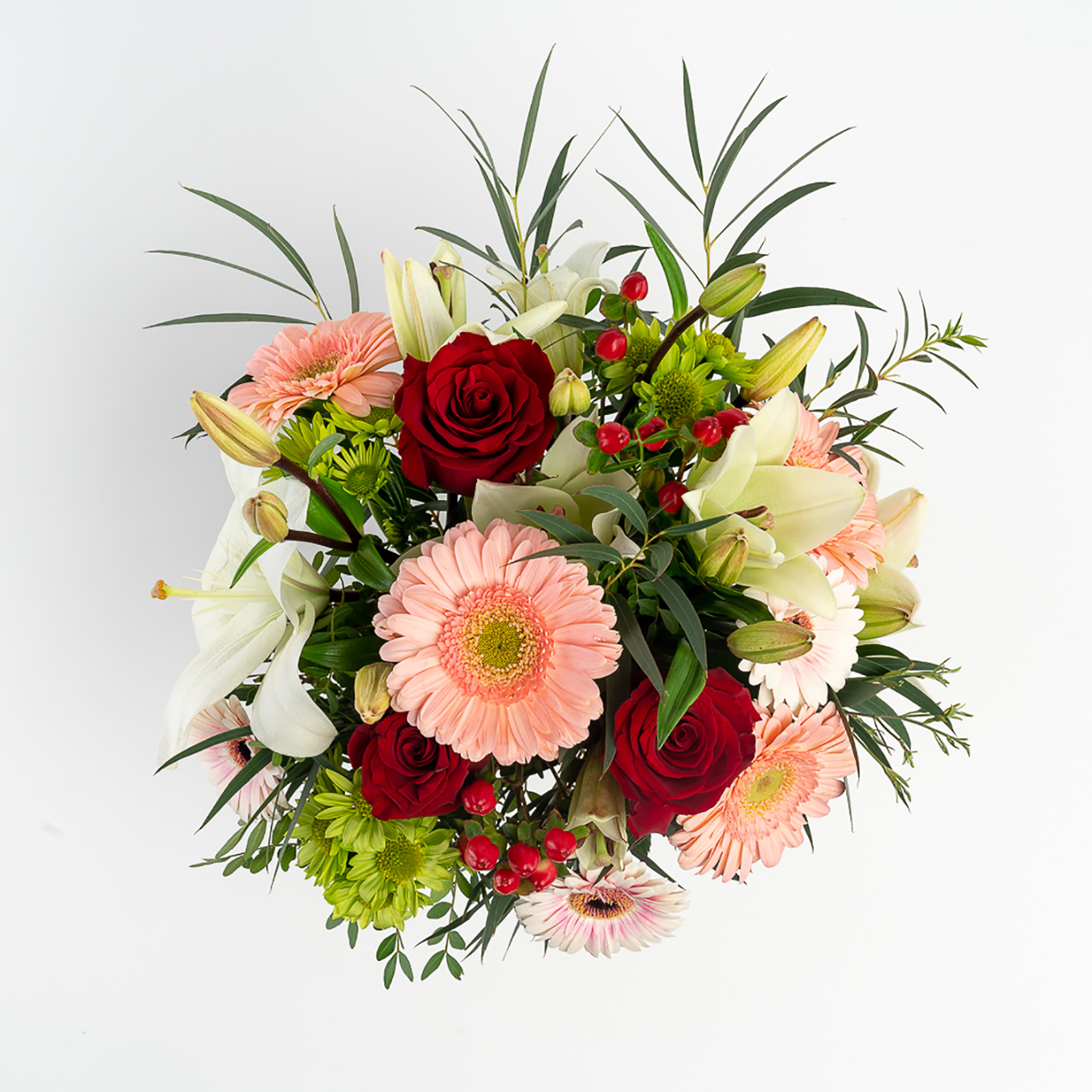 Ramos composto por lilium, margaridas,hipericão, rosas, gerberas e verdes variados.