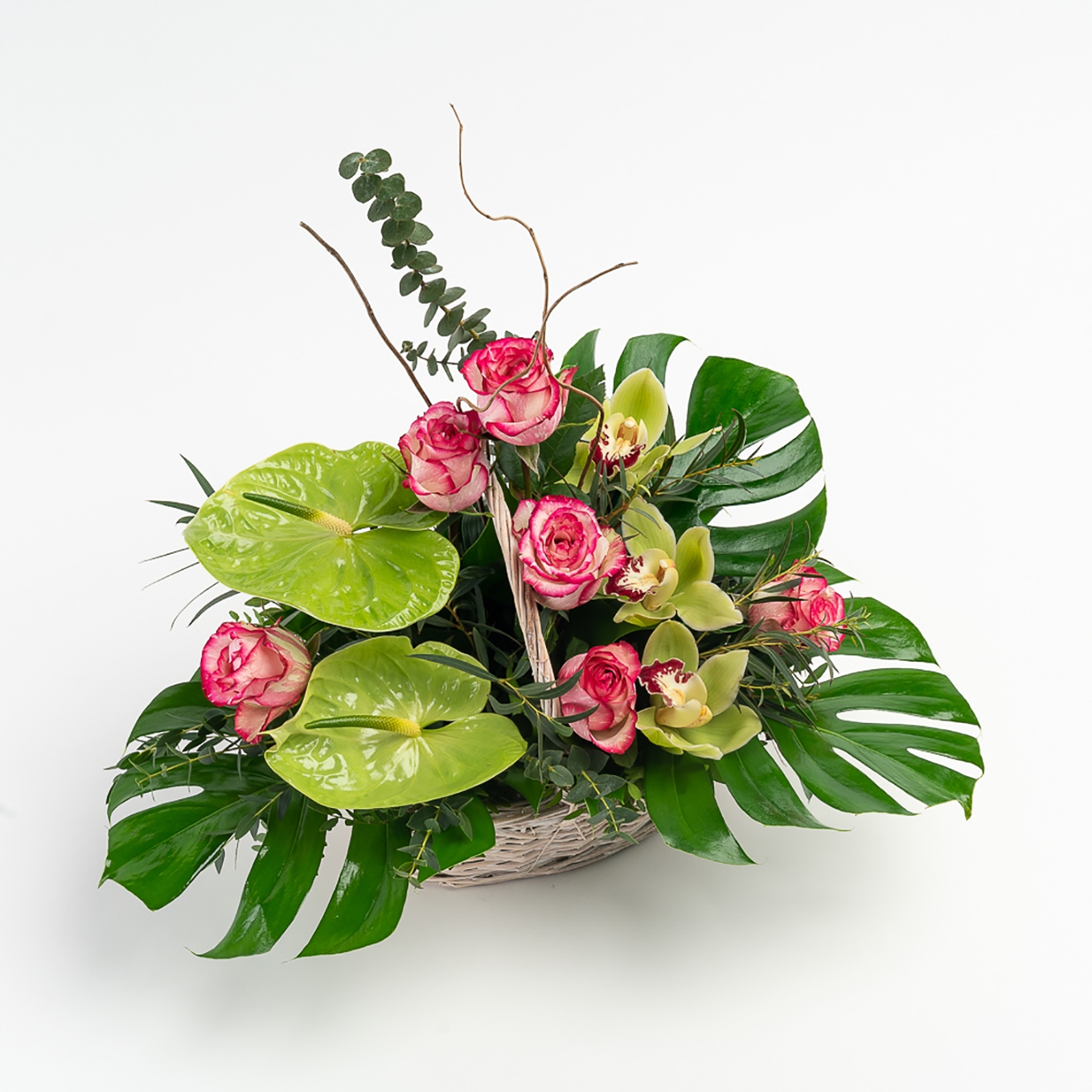 Cesta composta por rosas, orquídeas, antúrios e antúrios variados.