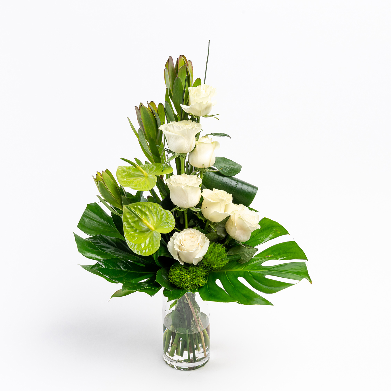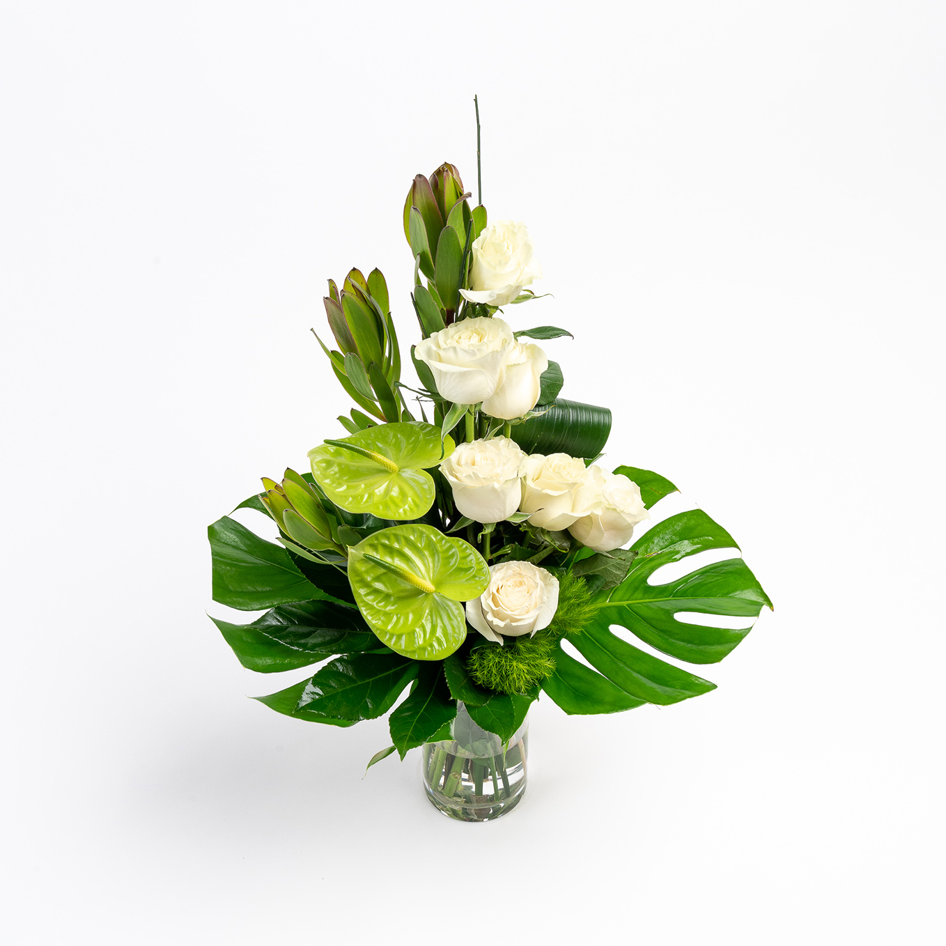 Ramo composto por rosas, antúrios e leucadendros e verdes variados. A imagem corresponde ao tamanho M.