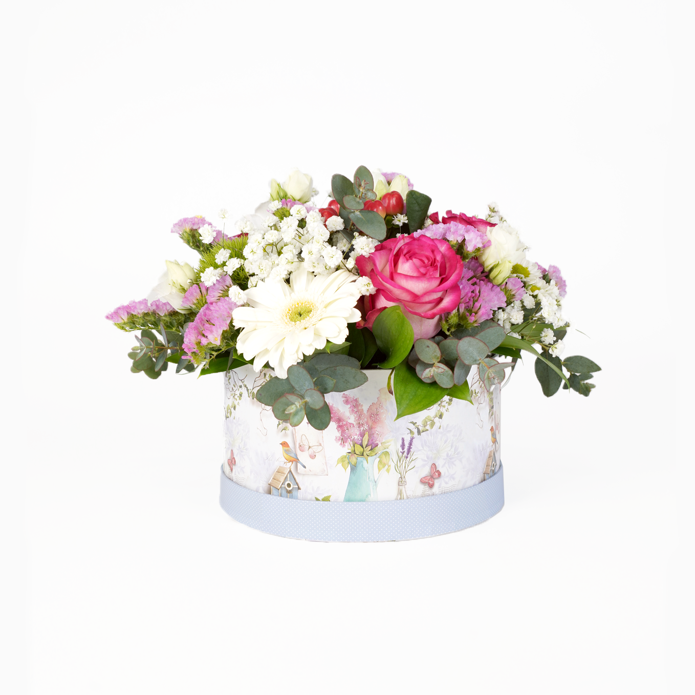 Caixa composta por rosas, gerberas, orquídeas, hipericão e verdes variados. Tamanho S: 3 rosas, 2 orquídeas, 1 hipericão, 3 gerberas e verdes variados. Tamanho M: 4 rosas, 3 orquídeas, 2 hipericão, 4 gerberas e verdes variados. Tamanho L: 3 rosas, 2 orquídeas, 1 hipericão, 3 gerberas e verdes variados. A imagem corresponde ao tamanho M.