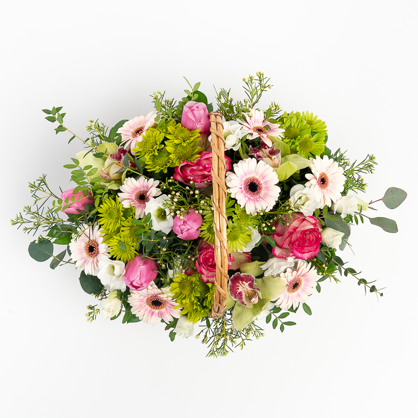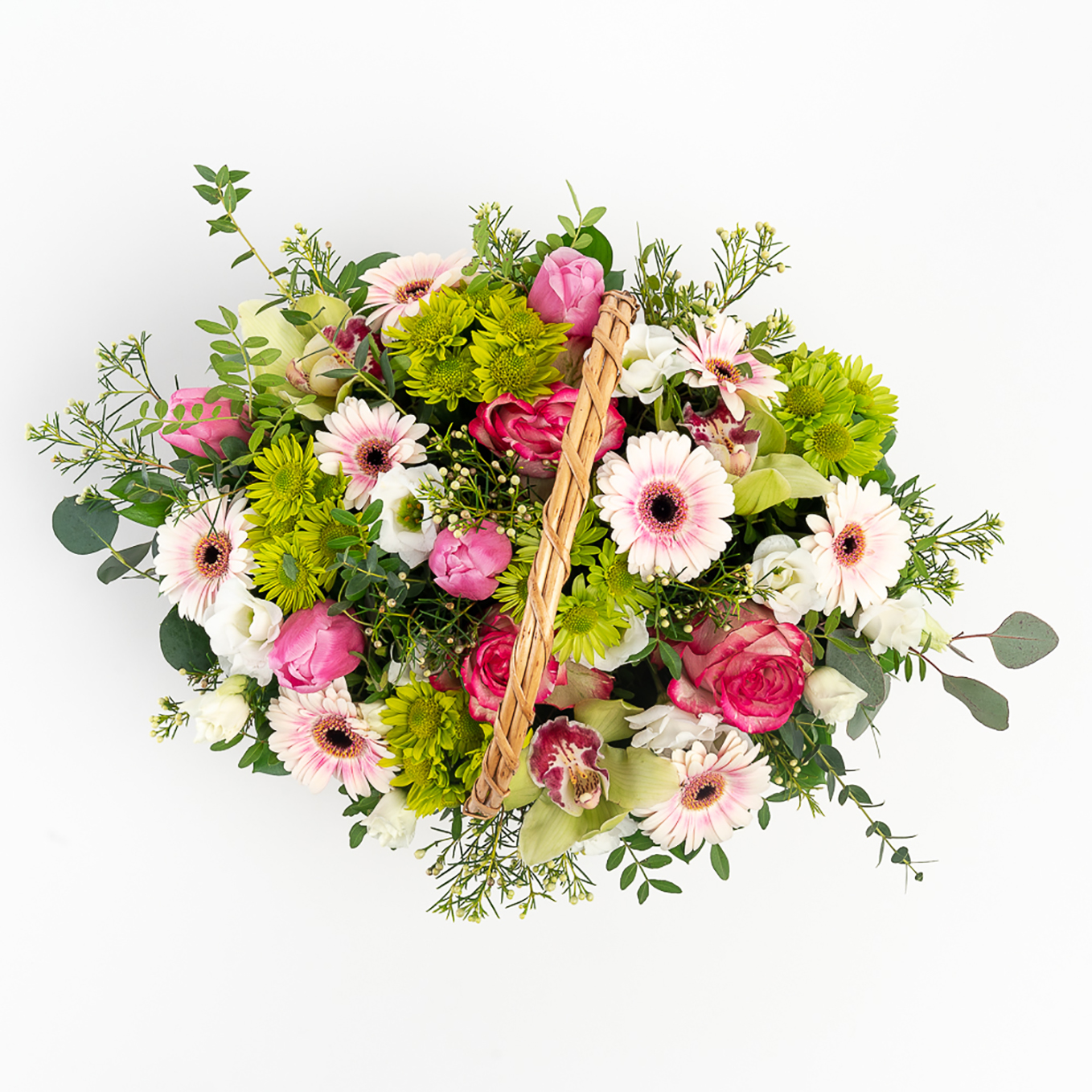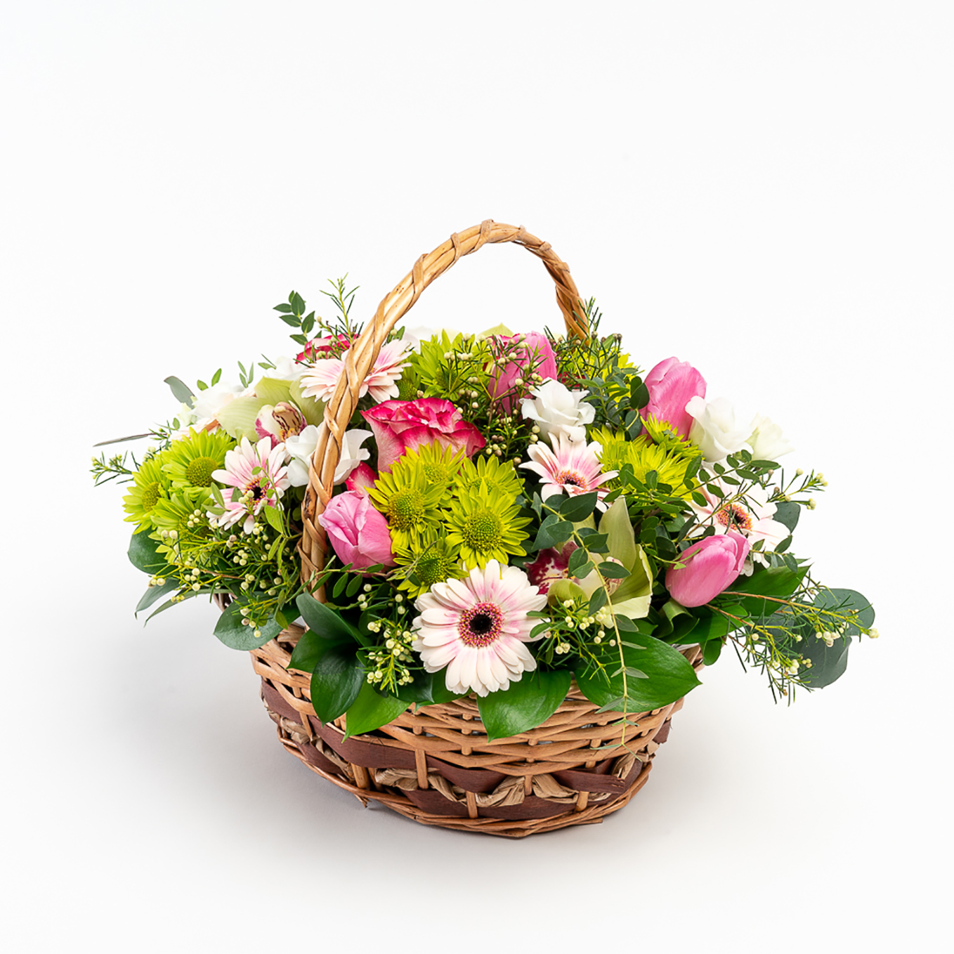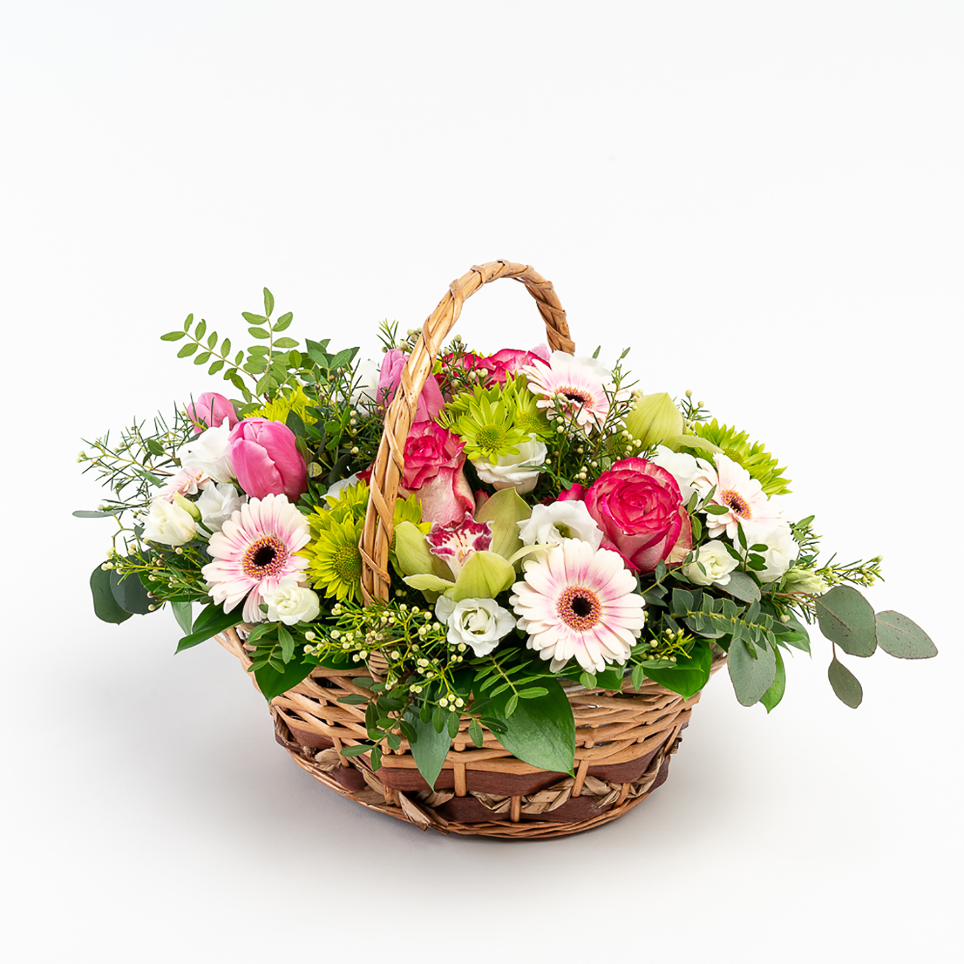 Cesta de flores campestre composta por rosas, gerberas, margaridas , tulipa, orquídeas , eustomas e verdura variada. A imagem corresponde ao tamanho M.