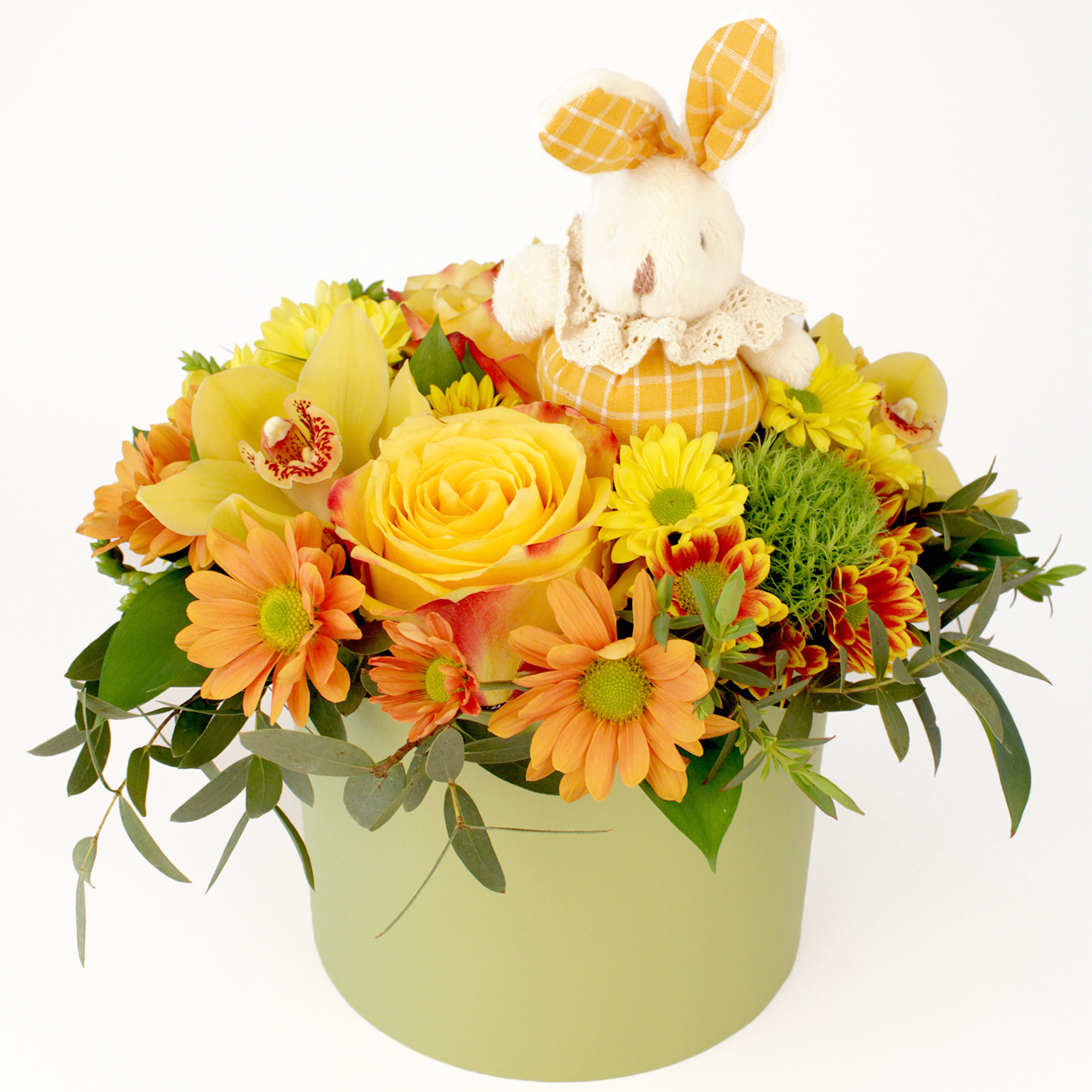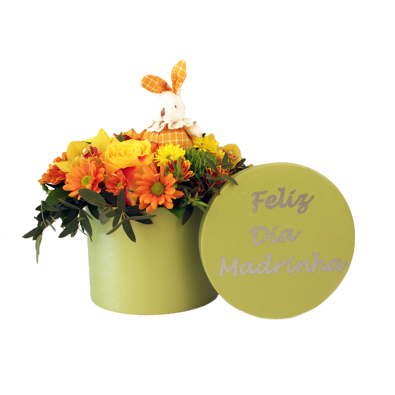 Caixa de flores campestres composta por Rosas, orquideas e margaridas.